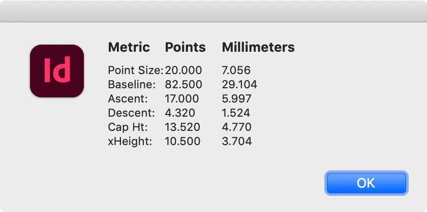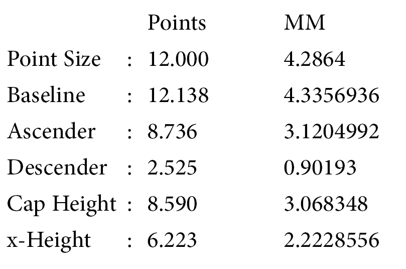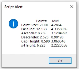 alert("\u0009Points:" + "\u0009" + " MM:\r" + "Point Size:" + p + "\u0009" + p*.3572 + "\r" + "Baseline: " + bl + "\u0009" + bl*.3572 + "\r" + "Ascender: " + a + "\u0009" + a*.3572 + "\r" + "Descender: " + d + "\u0009" + d*.3572 + "\r" + "Cap Height: " + ch + "\u0009" + ch*.3572 + "\r" + "x-Height: " + xh + "\u0009" + xh*.3572);