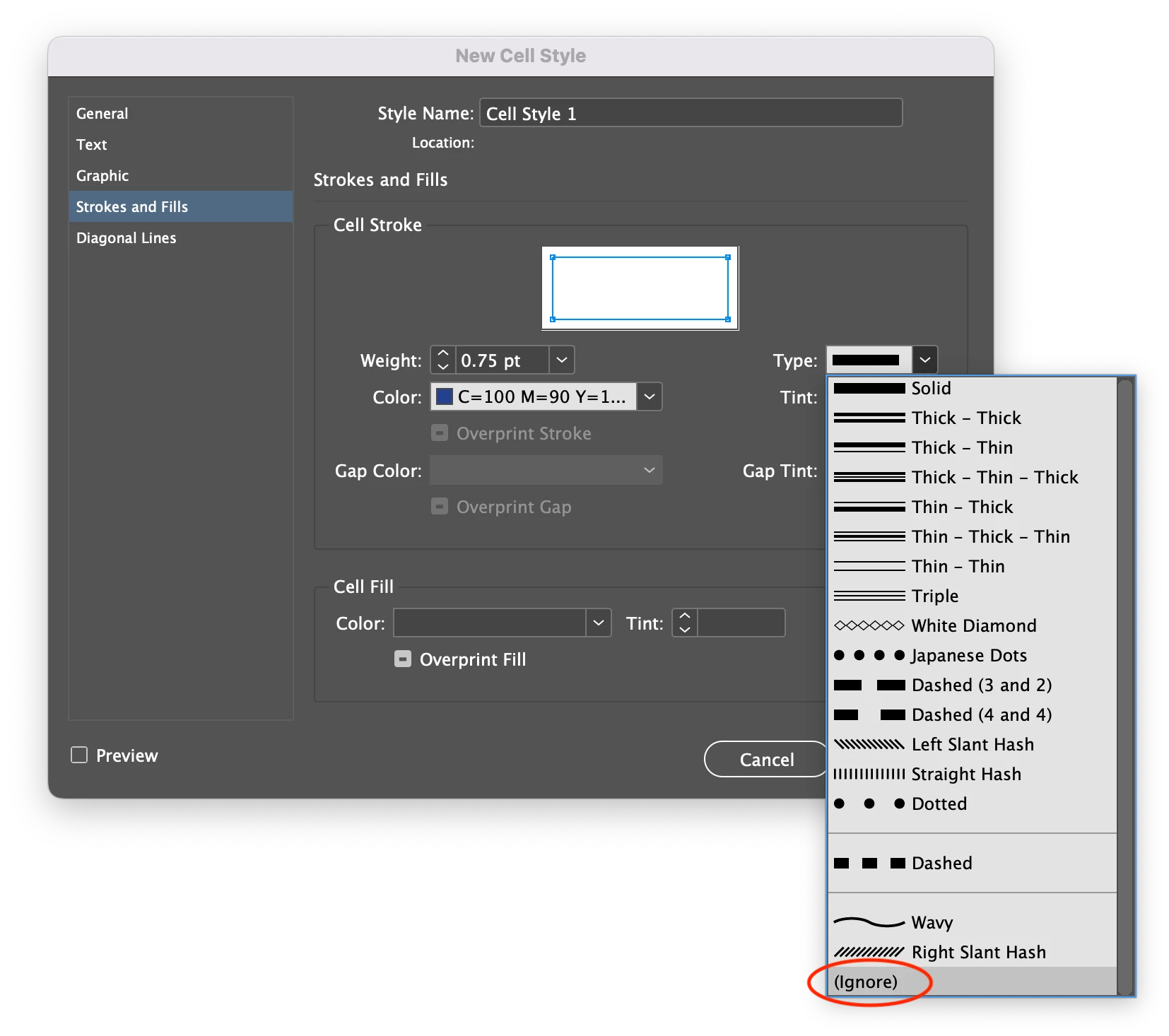 In Table>Cell Options, there is the option of choosing Cell Stroke>Type>None. I can't find this option in Cell Styles. Is there a way to get this feature as a cell style?