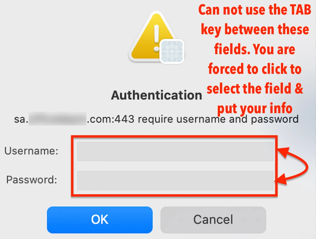 With third-party connectivity that needs CEP extensions and plug-ins to be installed, I'm running InDesign 2022 (17.3). I need to connect to a VPN because I work from home. I choose Connect from the Indesign menu bar, and then I sign in with Single Sign-On (SSO) using our Identity Providers (IDPs). The authentication window is the source of the issue. To enter my name, I must click on the Username field; however, I am unable to utilize the TAB key to navigate to the Password field. I am unable to switch between those fields.