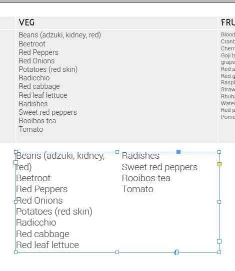 What I want to do is create a table, with the cells acting as overflow text boxes with 2+ columns (example below). It seems strange that currently the only way to achieve this is to manually meter the list length between 2 merged cells?? Surely this isn't an impossible request I'm asking!