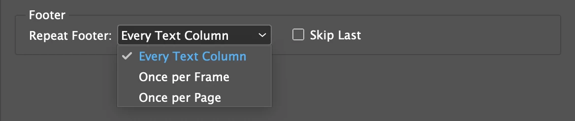 When I open "Table Setup" go to "Headers & Footers," I can skip the first header and skip the last footer, but I'm trying to get the footer to skip every page until the last page. Sadly, each of the options in the "Repeat Footer" drop down menu ("Every Text Column," "Once per Frame," and "Once per Page") don't affect this situation. I can imagine "Once per Frame" being helpful here, but only if I find a way to define the table on the final page as a separate frame(?):