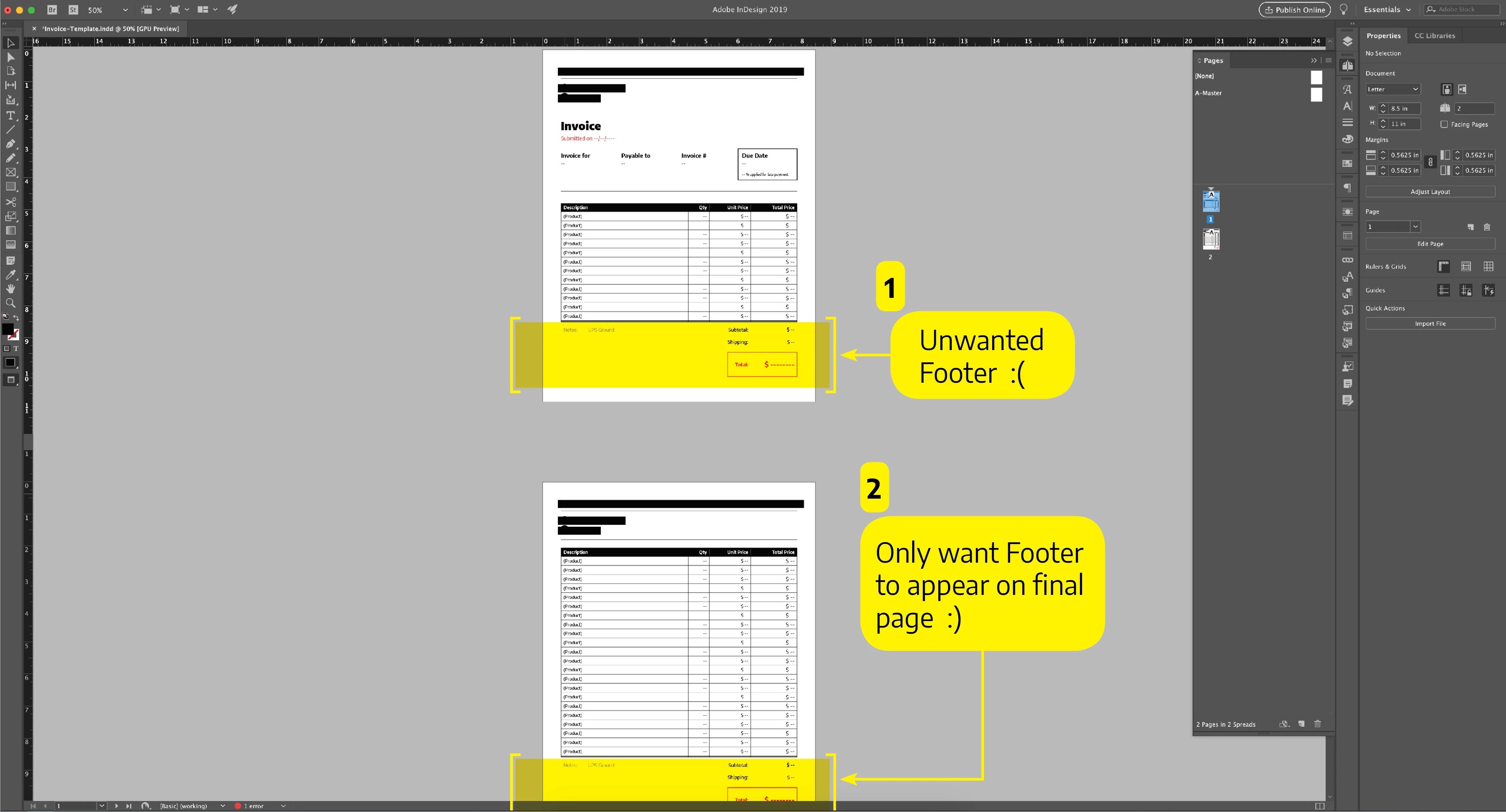 Hi, all! I'm making an invoice that needs to continue onto an indefinite number of pages, but I only want the footer to appear on the last page (so that the total only appears at the end). I know I could get rid of the footer in this table and manually create a new table as a fake footer at the end, but I want to make this as streamline as possible for future work.
