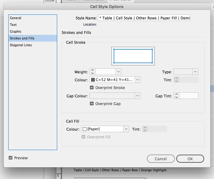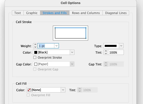 When I select the cell and open the cell style dialogue box at Strokes and Fills, what I see at this point in my "exploration" is captured in Table Cell Strokes 02.