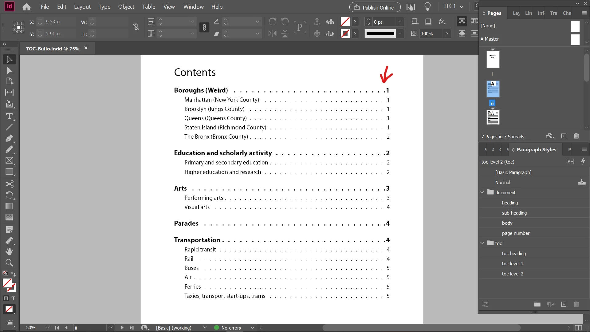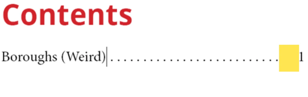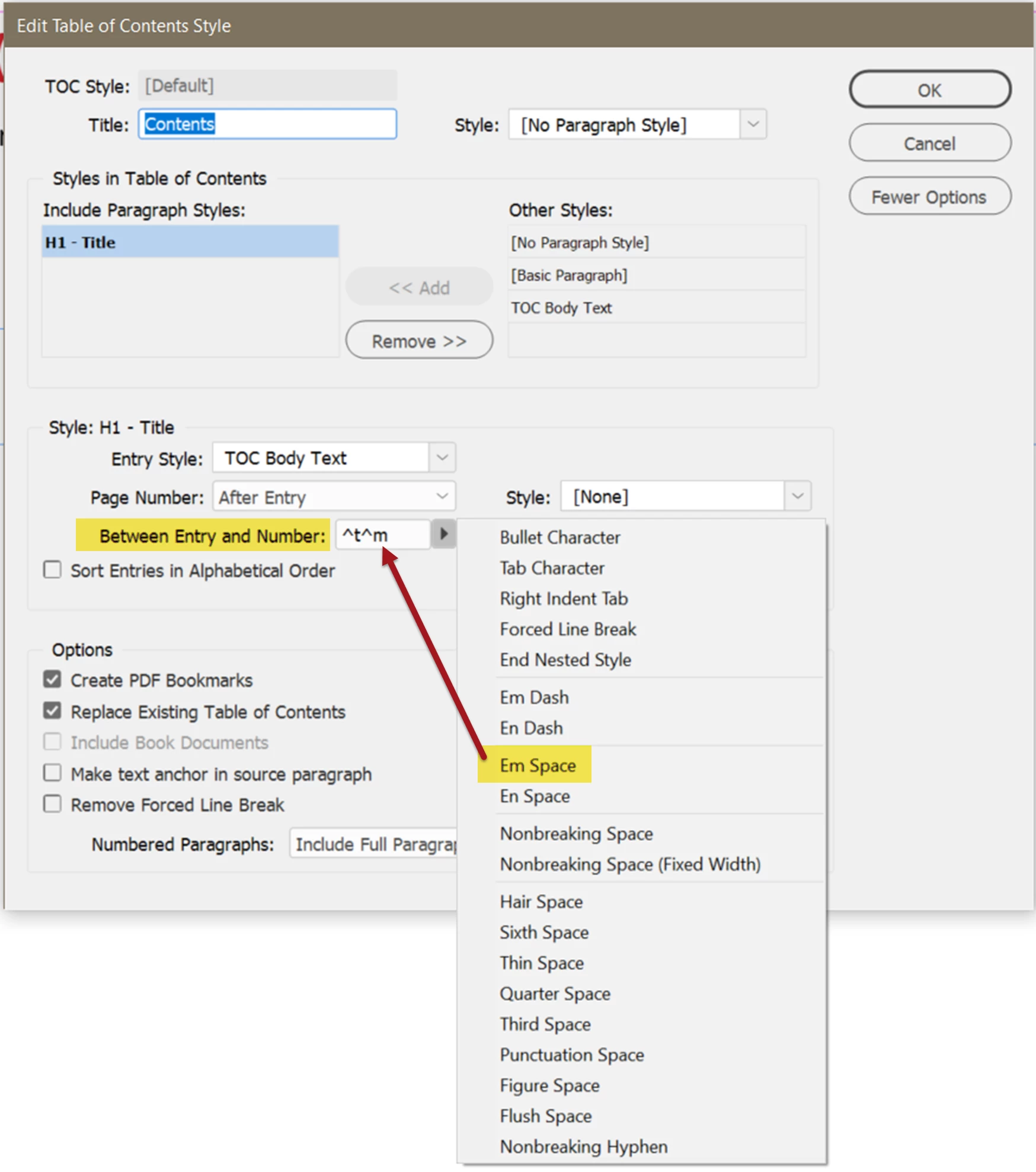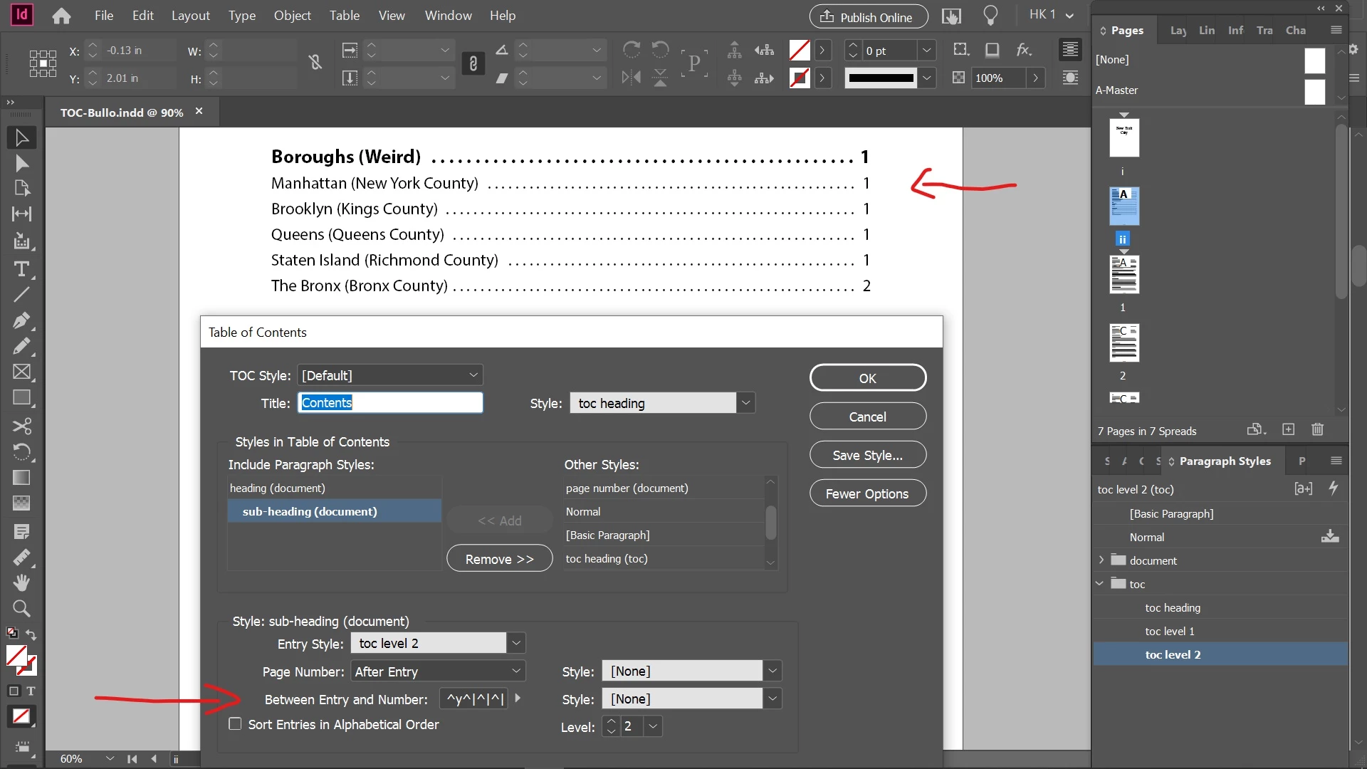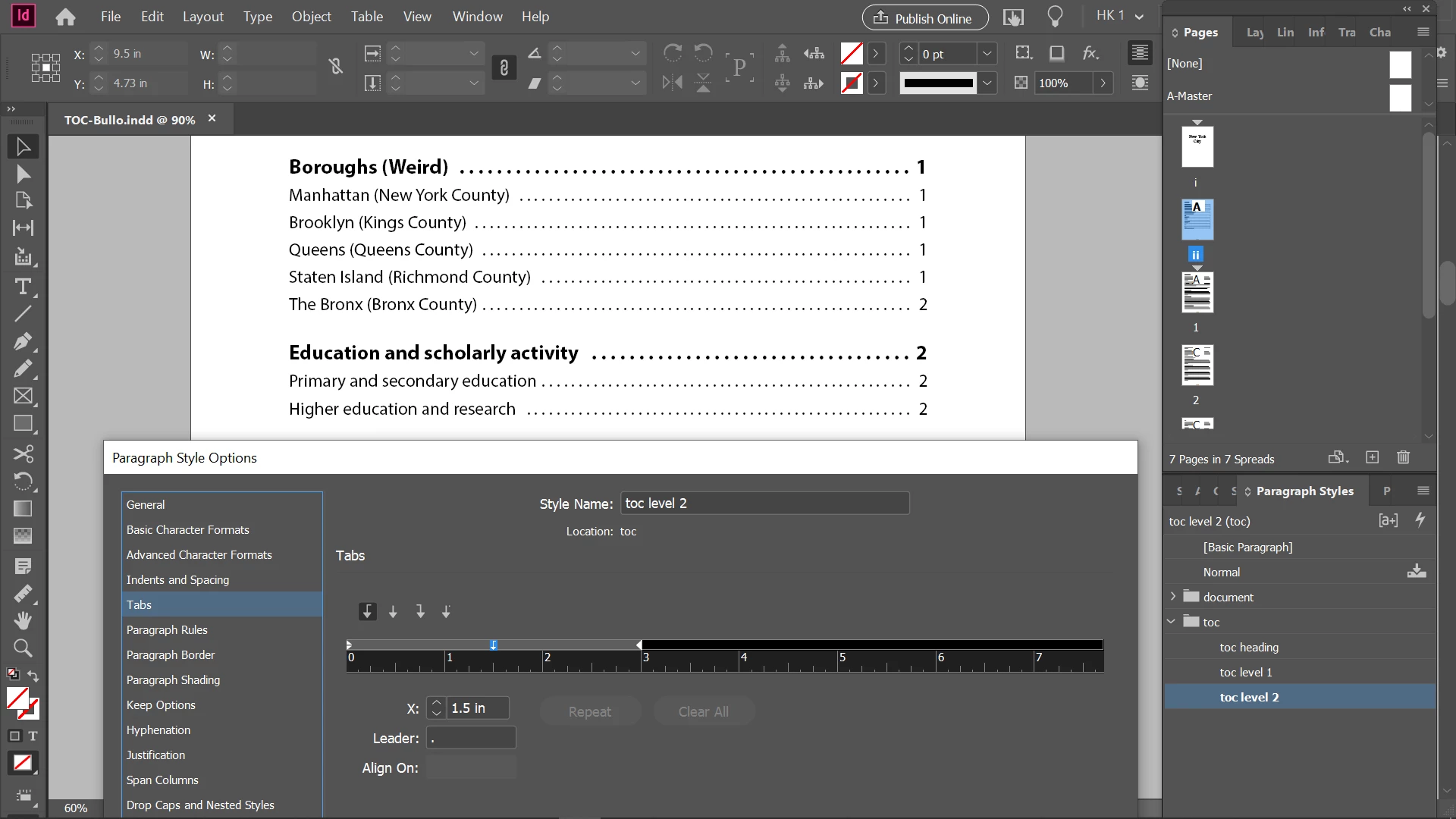 Looing at the line, "Manhattan (New York County)", Between Entry and Number is ^y^l^l^l (right indent tab + 3 hair spaces). When I add more hair spaces to give more space between the dot and the page number, nothing happens. Is it related with Tab I defined in paragraph style?