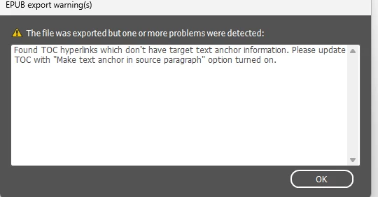 Hi I’ve run into an interesting challenge trying to convert my print book design into an EPUB in InDesign. I deleted the table of contents. But KindlePreviewer 3 gives the error message below when I try to download as EPUB, saying TOC hyperlinks have been found without target text anchor info.