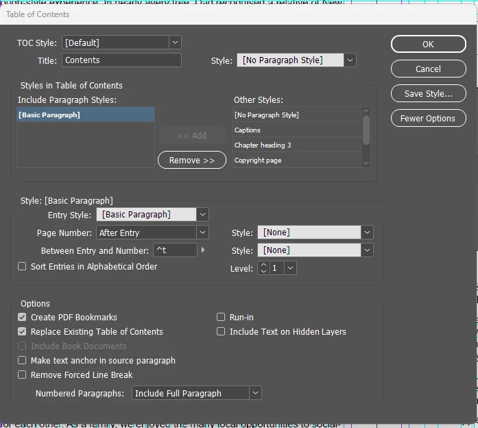 - Deleted the para styles that I had applied to TOC body copy and chapter heading.
