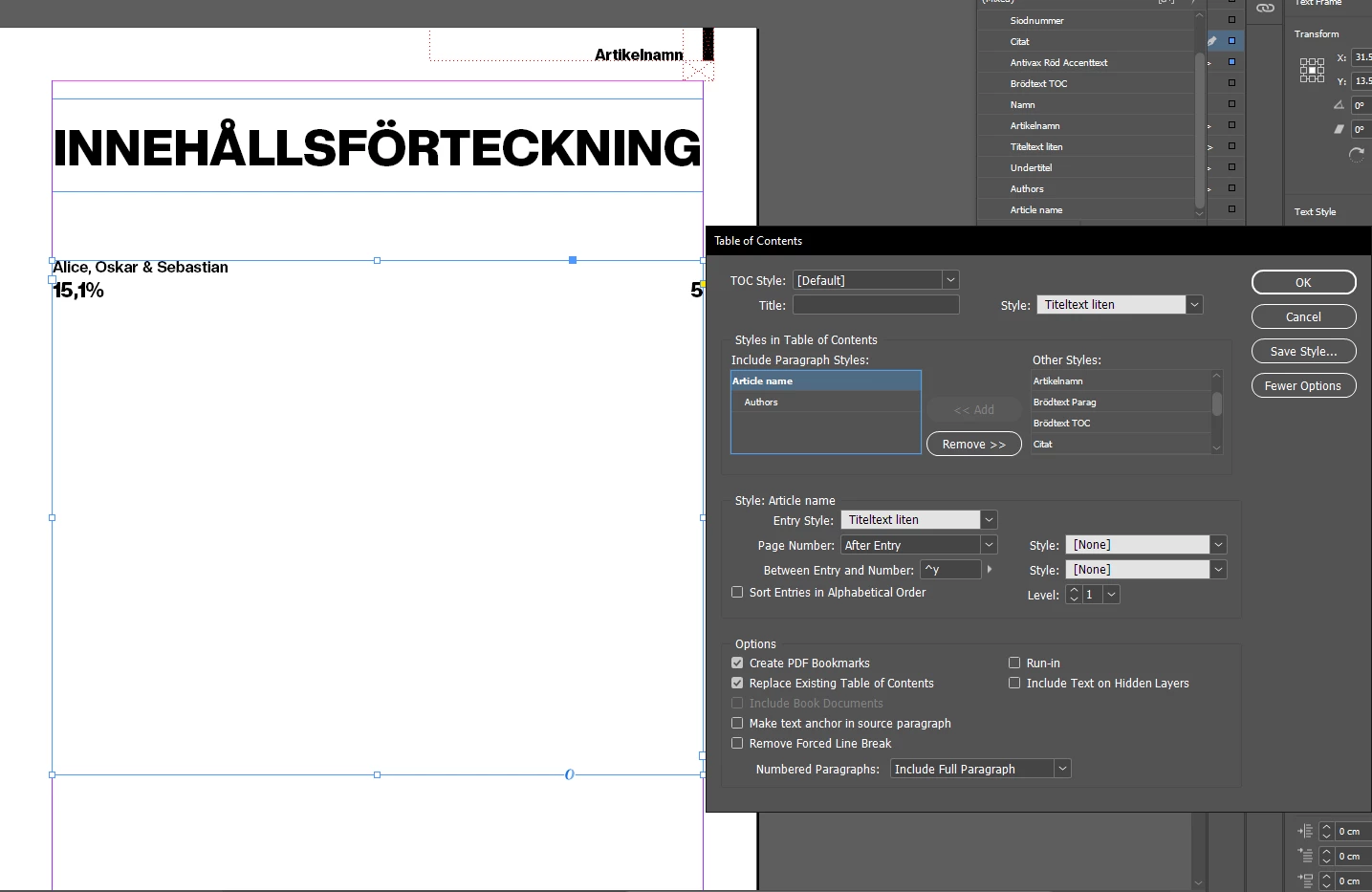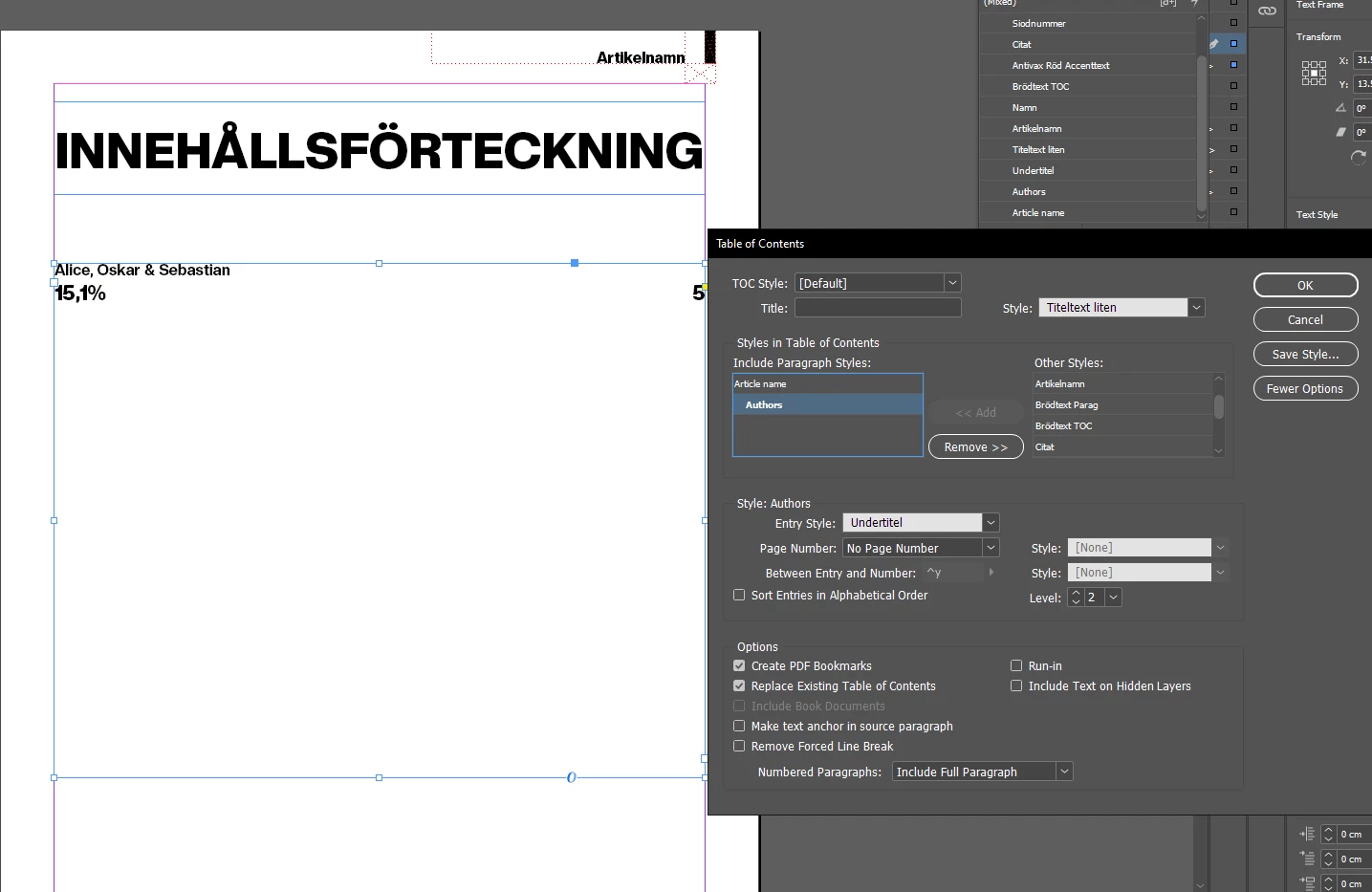 Hello. I've been trying to make a Table of Contents in InDesign. I've managed to make it work, except for this small issue I have. The levels of the styles refuse to work as they are assigned. My "Level 2" style (in this case "Alice, Oskar & Sebastian") appears above my "Level 1" style ("15,1%"), and it's driving me crazy! I can't figure out what's wrong! I just want "15,1%" to be placed above "Alice, Oskar & Sebastian".