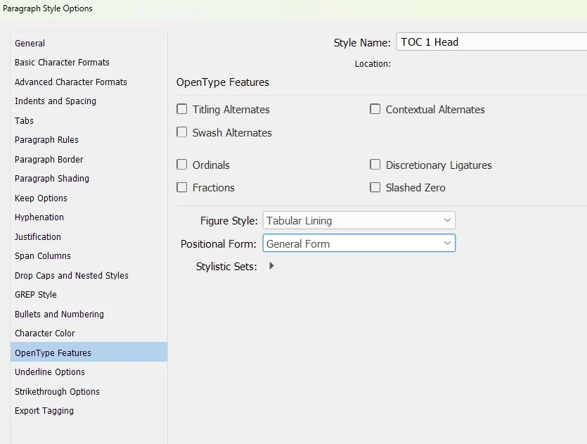 - Made a screen shot of the OpenType Features in the second "Character Style Options"