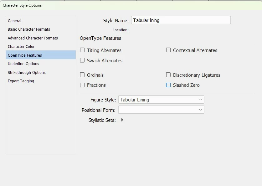 - Made sure the Paragraph Style was set up for Tabular lining figures. I deleted the "Based on" field in the Paragraph Style window to show its data (see first "Paragraph Style Options")