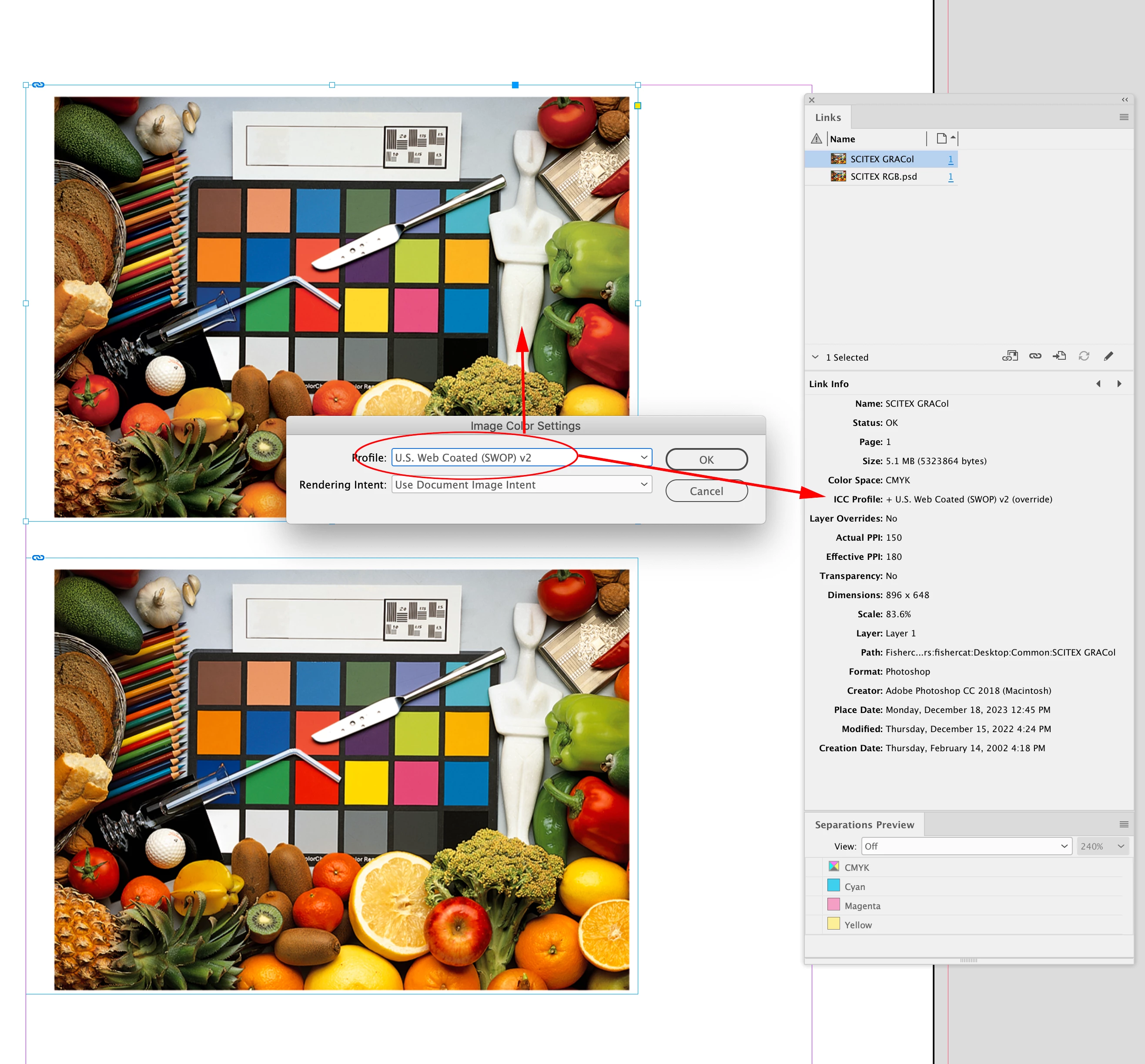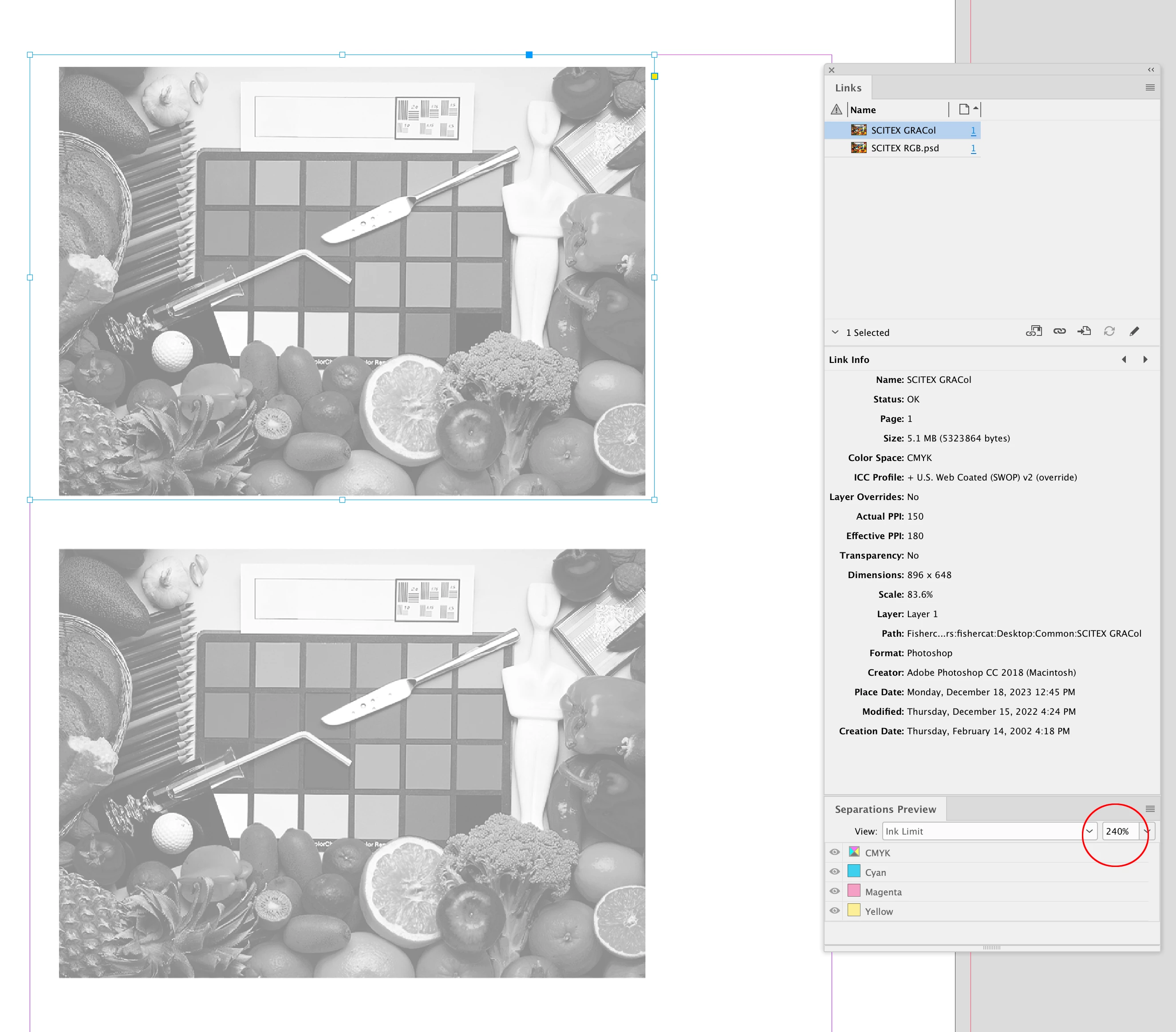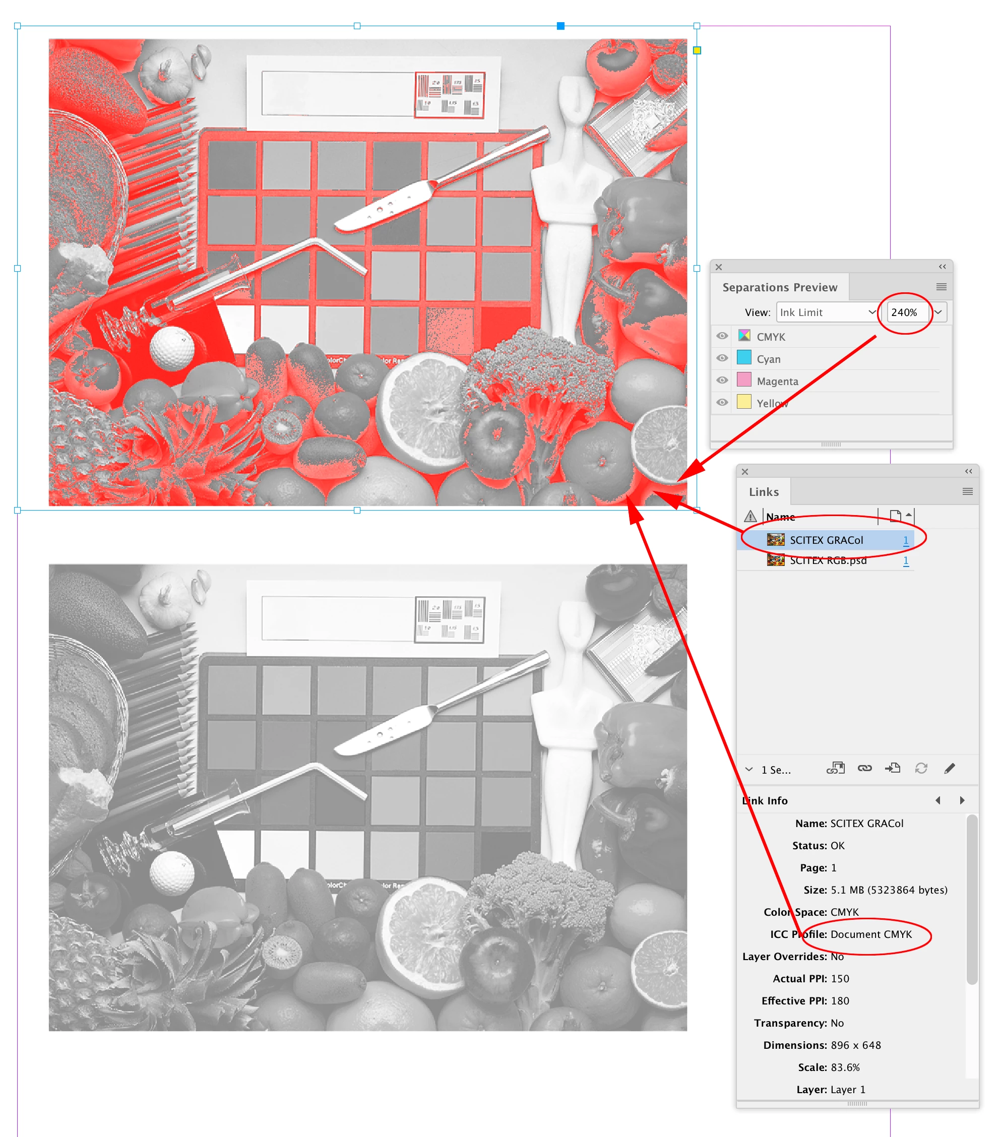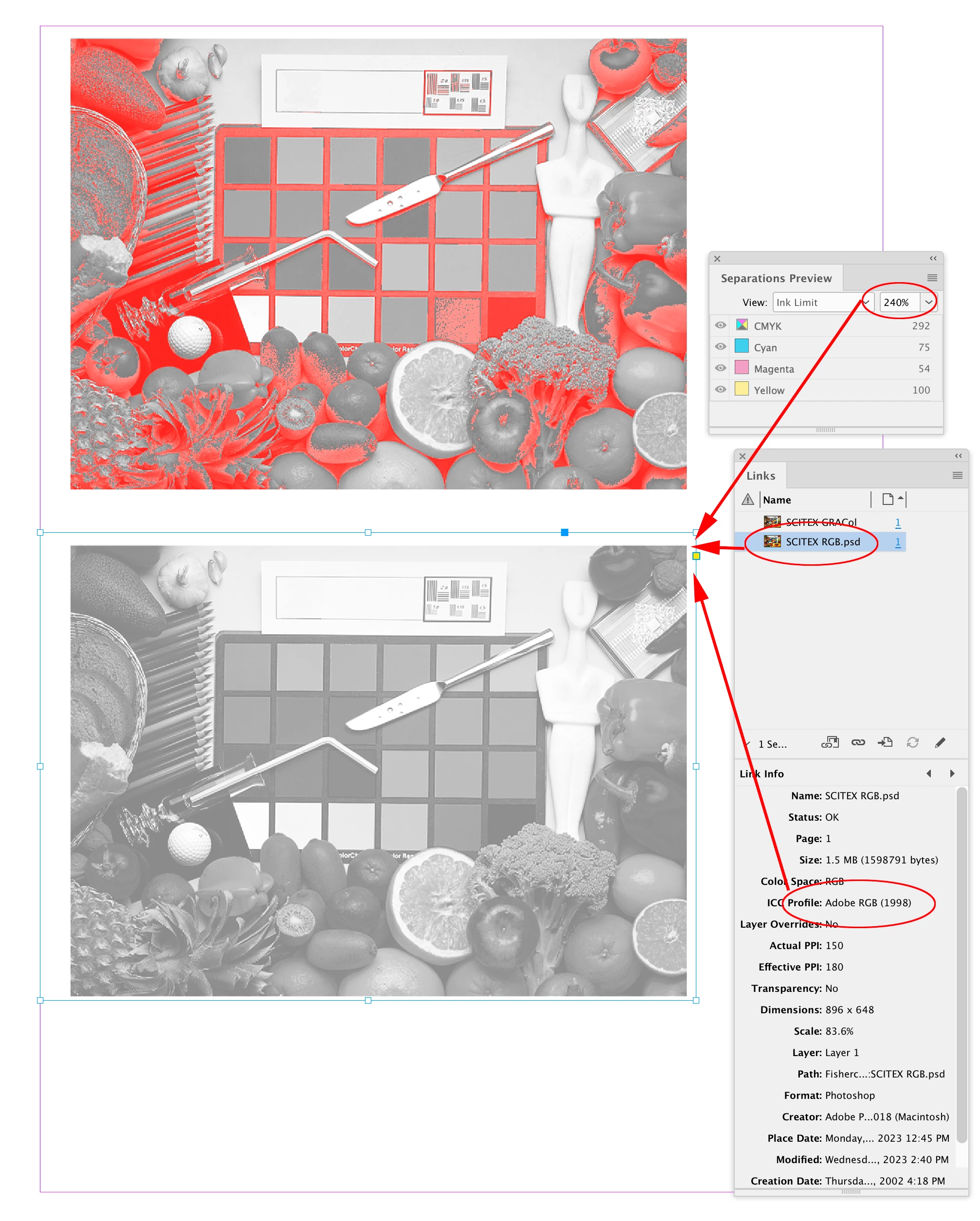 Je dois préparer un pdf pour une impression. Le profil ISO demandé est le ISOnewspaper26v4. Il est aussi précisé que le taux d'encrage max est de 240%. J'ai bien généré mon pdf en appliquant le profil mais lorsque je vérifie le taux d'encrage du visuel dans "Prépresse" d'Acrobat, il y a des zones qui dépassent largement 240% encre.