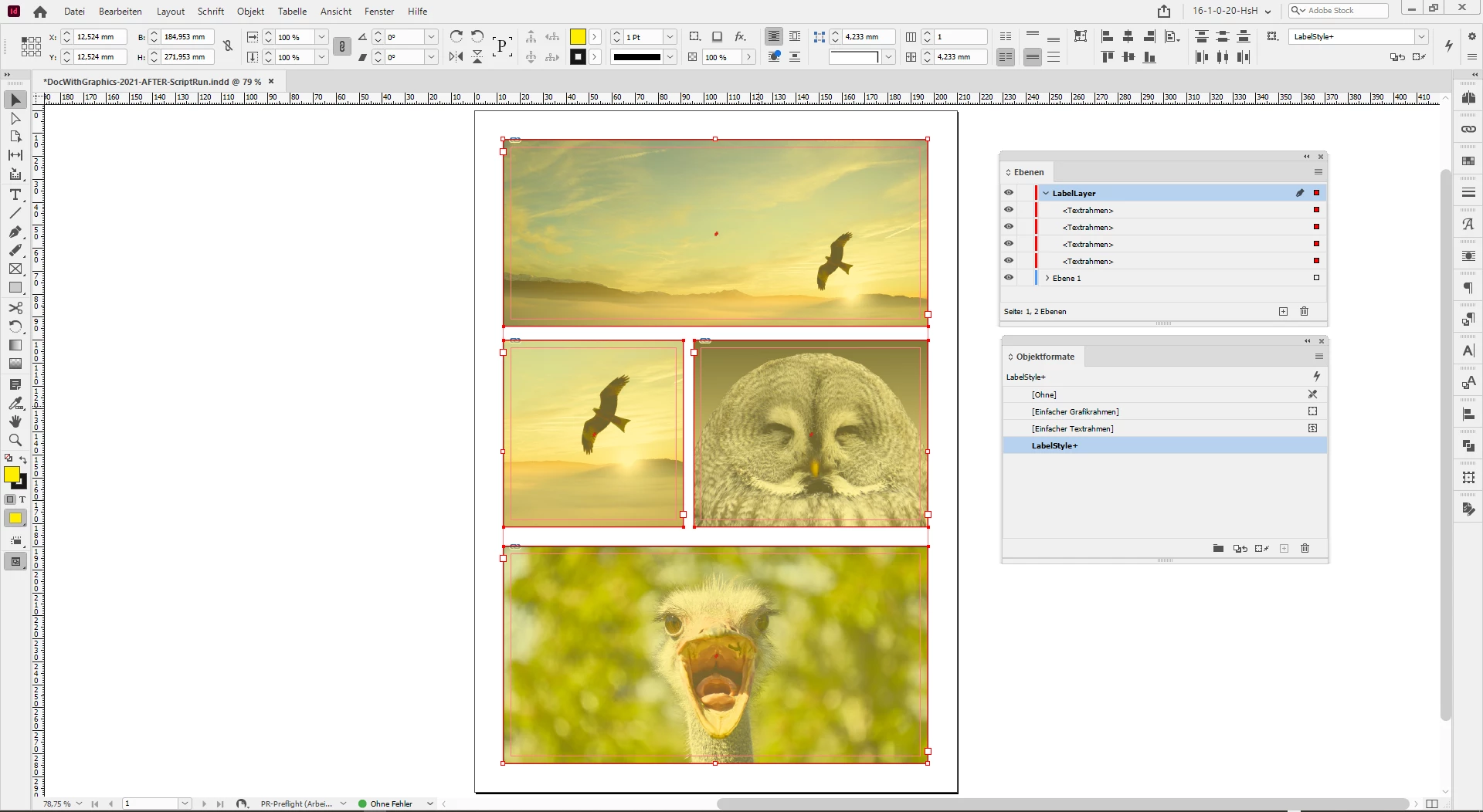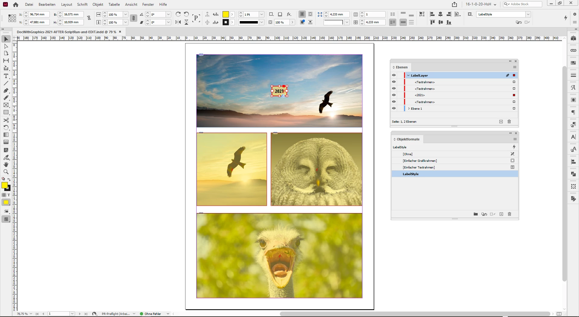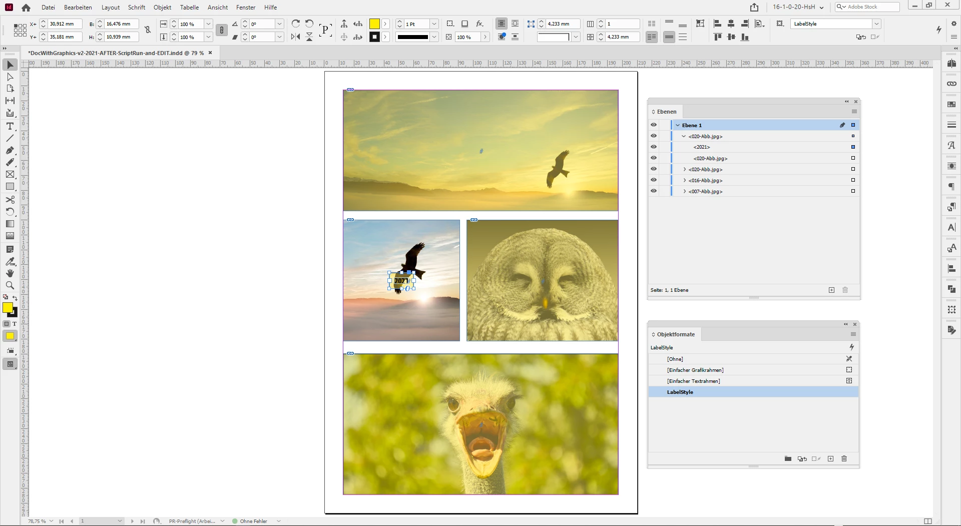 Applying the labels to each image was done with the attached _YearLabelAll.scpt which goes through the links for all the images, finds the year as the name of the folder in which the image is stored and adds a textbox with the year centered over the frame of the cropped image on the page. Sometimes the seemingly basic or trivial things pose the biggest problems for me and in this case it was specifying the color for the font in the textbox. I had to create a swatch in InDesign in order to do this, but I am sure it must be possible some other way. I tried to also group the textbox and the image, but then realized that this prevented me from keeping the image visible when I made the layer for the text box invisible. This script also failed on images that were on the pasteboard rather than on a page, but I only had four of those and I was able to move them to a temporary page and use _YearLabelSelected.scpt to put a lable on just the selected images.