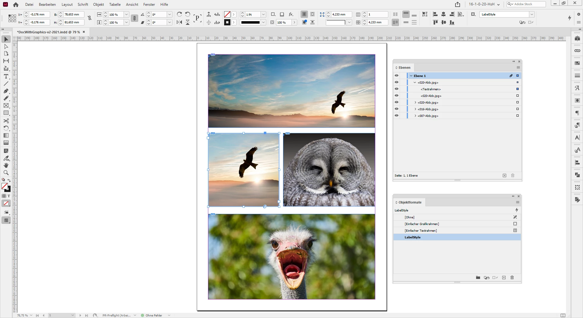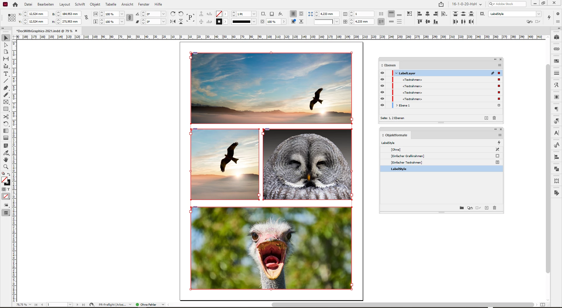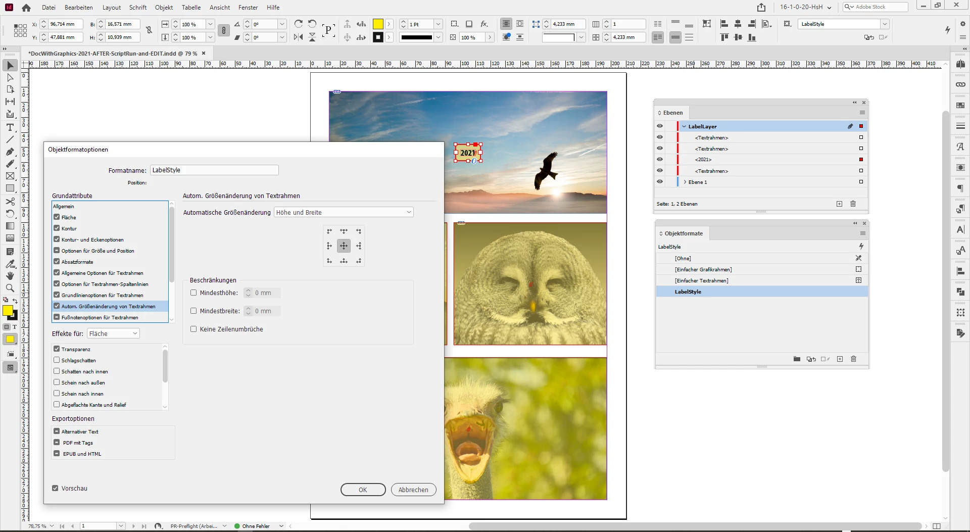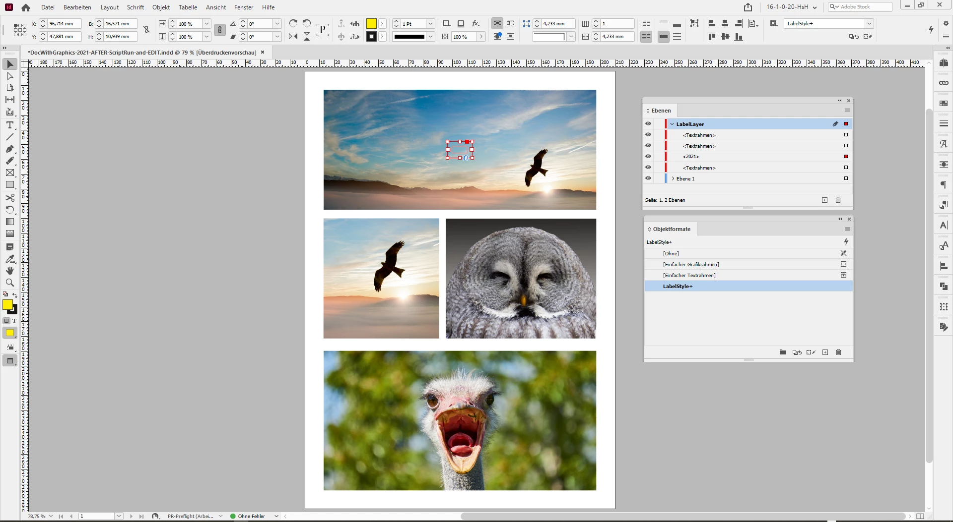 Applying the labels to each image was done with the attached _YearLabelAll.scpt which goes through the links for all the images, finds the year as the name of the folder in which the image is stored and adds a textbox with the year centered over the frame of the cropped image on the page. Sometimes the seemingly basic or trivial things pose the biggest problems for me and in this case it was specifying the color for the font in the textbox. I had to create a swatch in InDesign in order to do this, but I am sure it must be possible some other way. I tried to also group the textbox and the image, but then realized that this prevented me from keeping the image visible when I made the layer for the text box invisible. This script also failed on images that were on the pasteboard rather than on a page, but I only had four of those and I was able to move them to a temporary page and use _YearLabelSelected.scpt to put a lable on just the selected images.