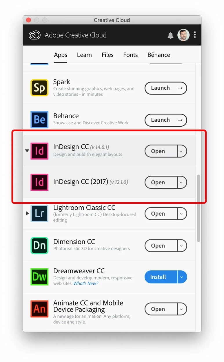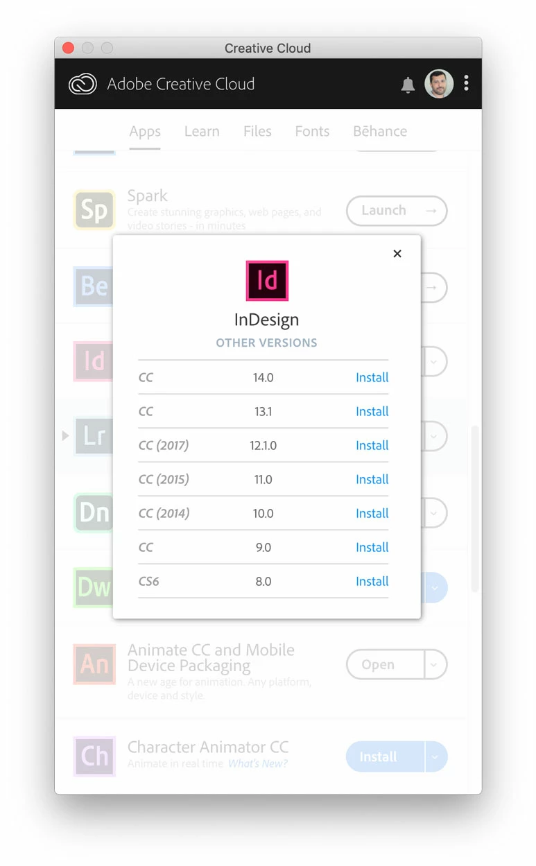 From the same Adobe CC desktop menu, click on "Install" link to start downloading and installing a previous versions, this way you may download InDesign CC (2015) or CC (2017).