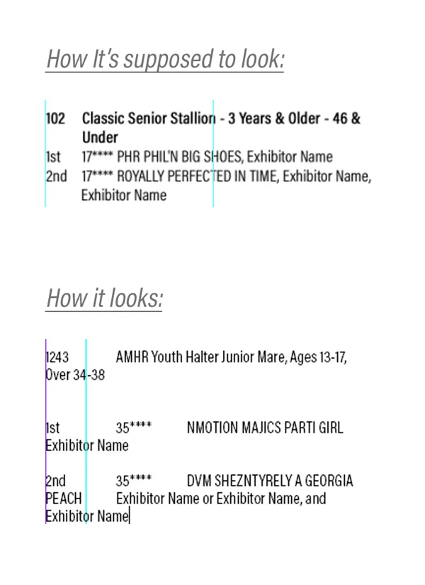Hello! I am trying to paste text from a Photoshop document into InDesign, but it isn't keeping the formatting. I made sure the Clipboard handling "All Information" is checked. I've tried pasting without formatting, etc. but nothing is working. I am attaching a sample bit of text with how it's supposed to look vs how it is pasting into InDesign. I can PM you a page of the document if needed. Font is Acumin Pro Condensed - 8pt and 9pt leading. The "Class Name" is bold font with the 1st and 2nd place text lines in regular font. No Spacing.
