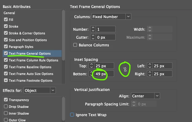 When I attempt to adjust the text frame inset spacing in an object style, the text frame does not change or, the text frame adjusts evenly on all sides despite only adjusting the top for example.