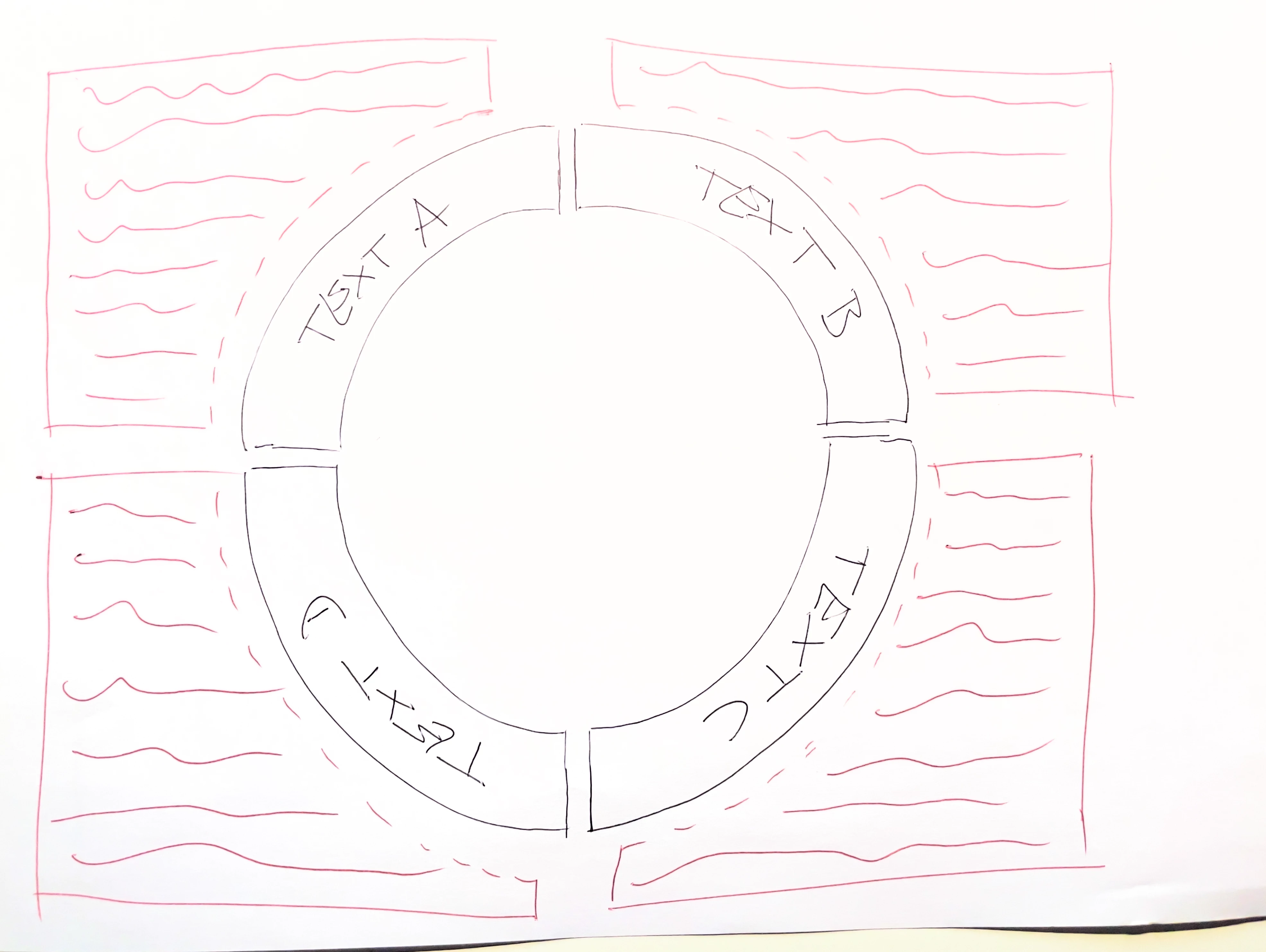 I made my circle consisting of 4 parts. and with curved text etc. but now I would like to ad text outside for a description. If I make the inside of the circle as a text field, the text is wrapped corretly along the path, but on the outside not.