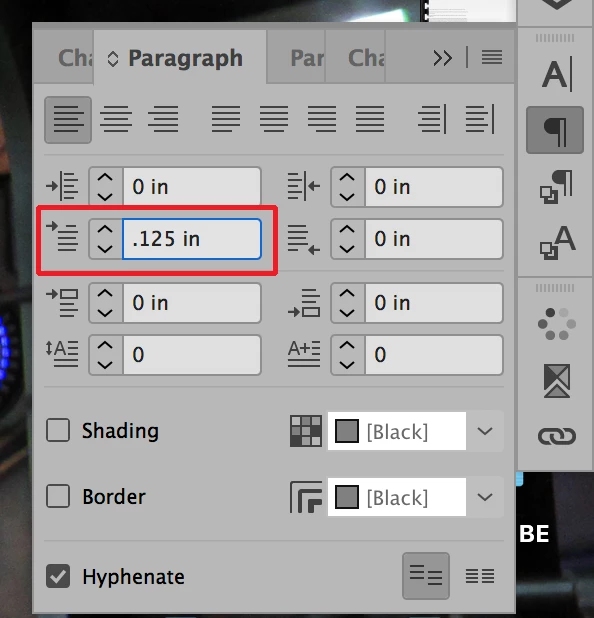 The Paragraph Style should be set to Align Left. It should have Hyphenation set to 9,3,4,1, 1p6, off, off, off. The Justification settings should be Word Spacing at 80/100/120; the Letter Spacing at -5/0/5%; and the Glyph Scaling at 95/100/105%.