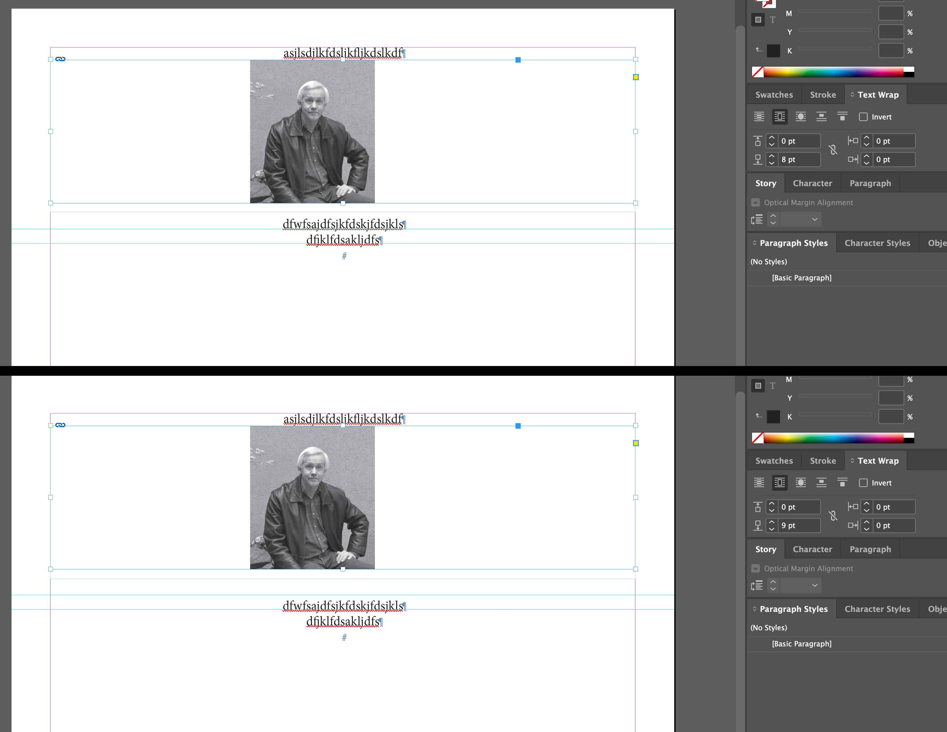 I'm laying out a book which has a few pictures. I've got text flowing above and below the picture so I set Text Wrap to Jump Object for my image. The image frame is sitting over the text frame. I was trying to add a little more vertical space between the image and first line of text below it. My rulers are set to points. I started to increase the Bottom Offset by 1 point at a time. Once the offset was close enough to the 1st line of text, I was expecting it to push the text downward by 1 point. Instead when I got to 9 points the text jumps down a whole line. It will behave the same way when I go from 23 - 24 points. Align to Grid is turned off. I did notice that if I drag the top of my text frame below the image, and increment the Bottom Offset, only then does it push the first line down 1 point at at time.