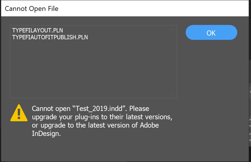 Error message: Cannot open "filename.indd". Please upgrade your plug-ins to their versions, or upgrade to the latest version of Adobe InDesign.