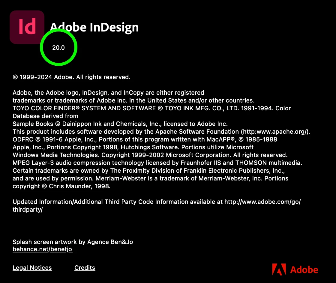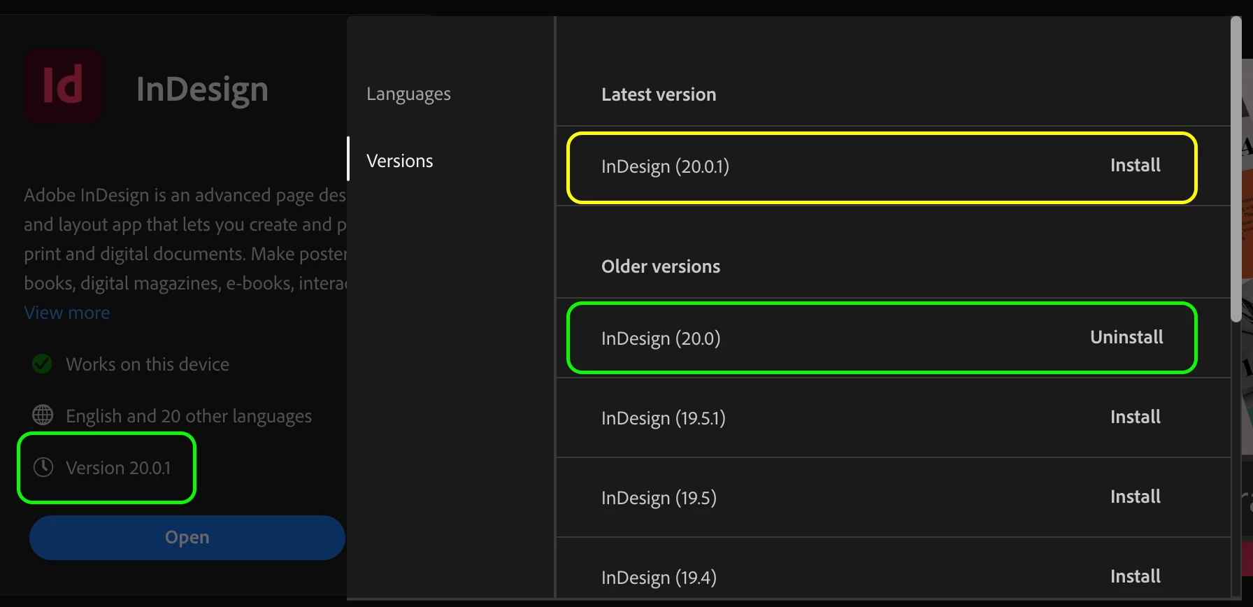 When I checked the installed version, the information presented generates me insecurity of the installed version, because in the Creative Cloud window on the left side says version 20.01 (it would seem that this would be the installed version) on the right side says version 20.0 is installed (it gives the option to uninstall) and in the versions available to install, 20.01 appears ... although within the program in “about” says 20.0 ... so I do not know for sure which one is installed ...
