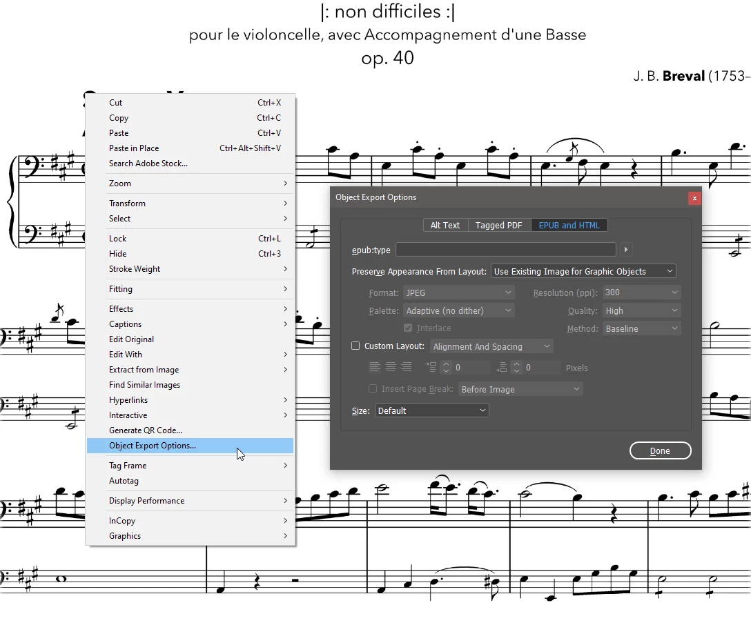 I use InDesign to create my sheet music editions that I then publish here. I create the musical score in Avid Sibelius, export it to PDF, then write the text in Word, format it, then build everything in InDesign (17.x for today's example). Once ready, I export it to PDF for those services that need a PDF and to EPUB for—sigh—Apple Books.