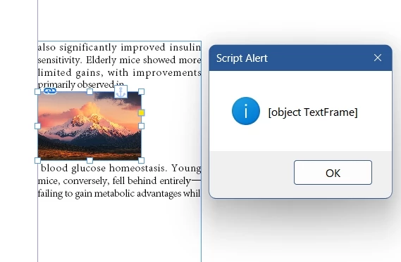 Instead, to get the textFrame that a character is in, go directly, using the parentTextFrames property: document.selection[0].parent.parentTextFrames[0].geometricBounds[3]