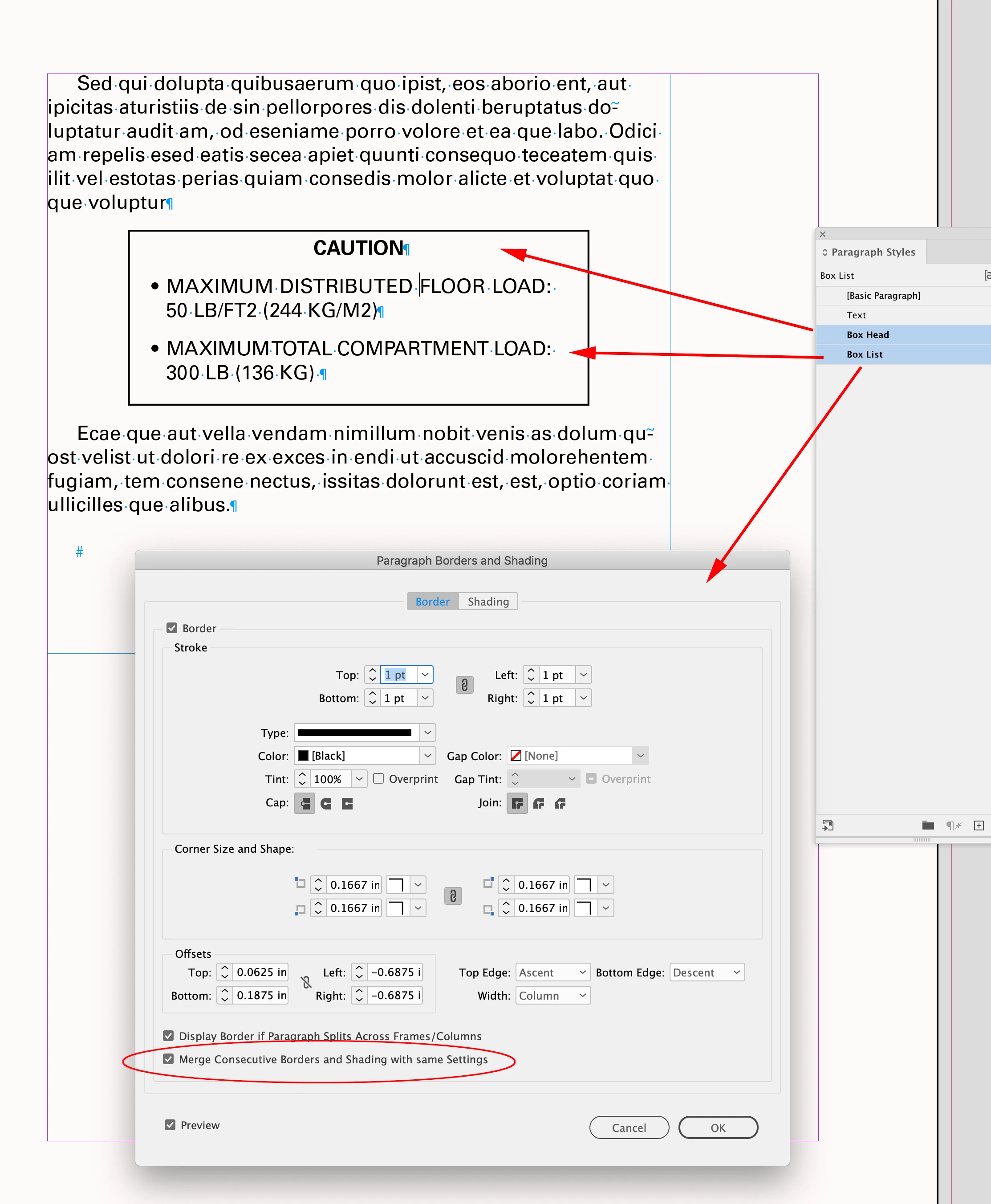 It gets tricky, but the boxed text can be narrower—I’ve attached a sample .IDML with Paragraph Styles for the boxed head and list. Note, to merge the head and list paragraphs they have to have the same Borders and Shading settings, which is the case in this example.
