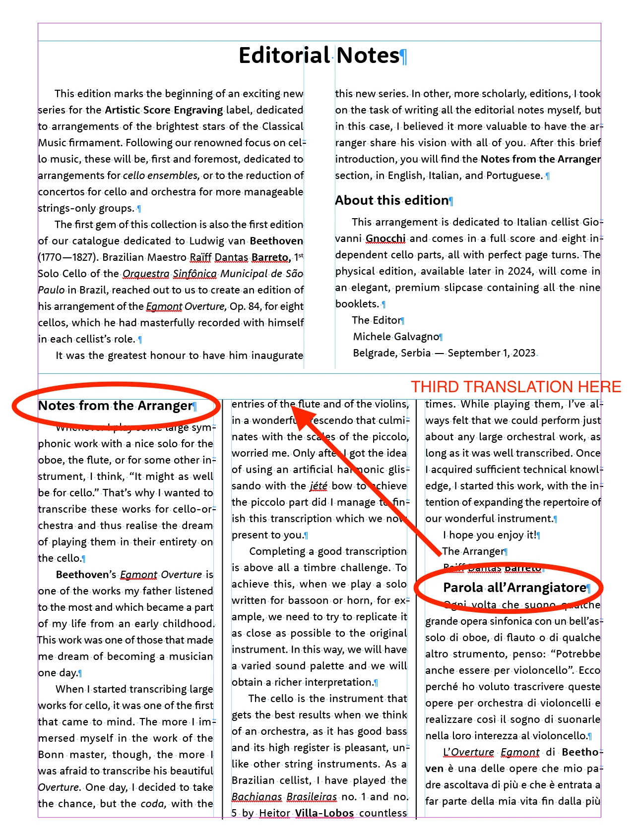 That should get you started and will work for one-page layouts. If the three-column material may extend over more than one page, a different approach will be needed. You will also need four separate source text files, which you can do by cutting sections from a single source doc. (Cut the English, paste it in place, cut the Portuguese, paste it, etc.)