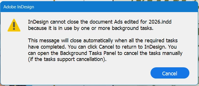 After cancelling just the export task, I was able to save and close both documents, but hilariously, those Adding Font tasks were still running with no document open! Fortunately, closing InDesign and reopening the documents worked, and I was then able to export a PDF. But good grief, this font thing is annoying.