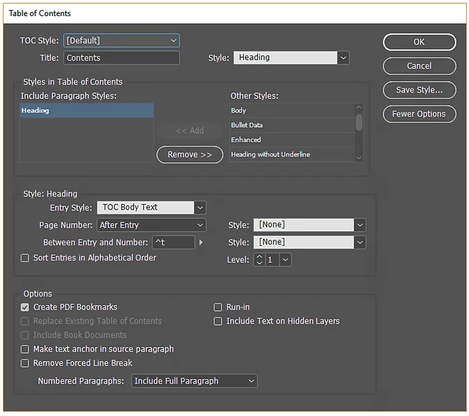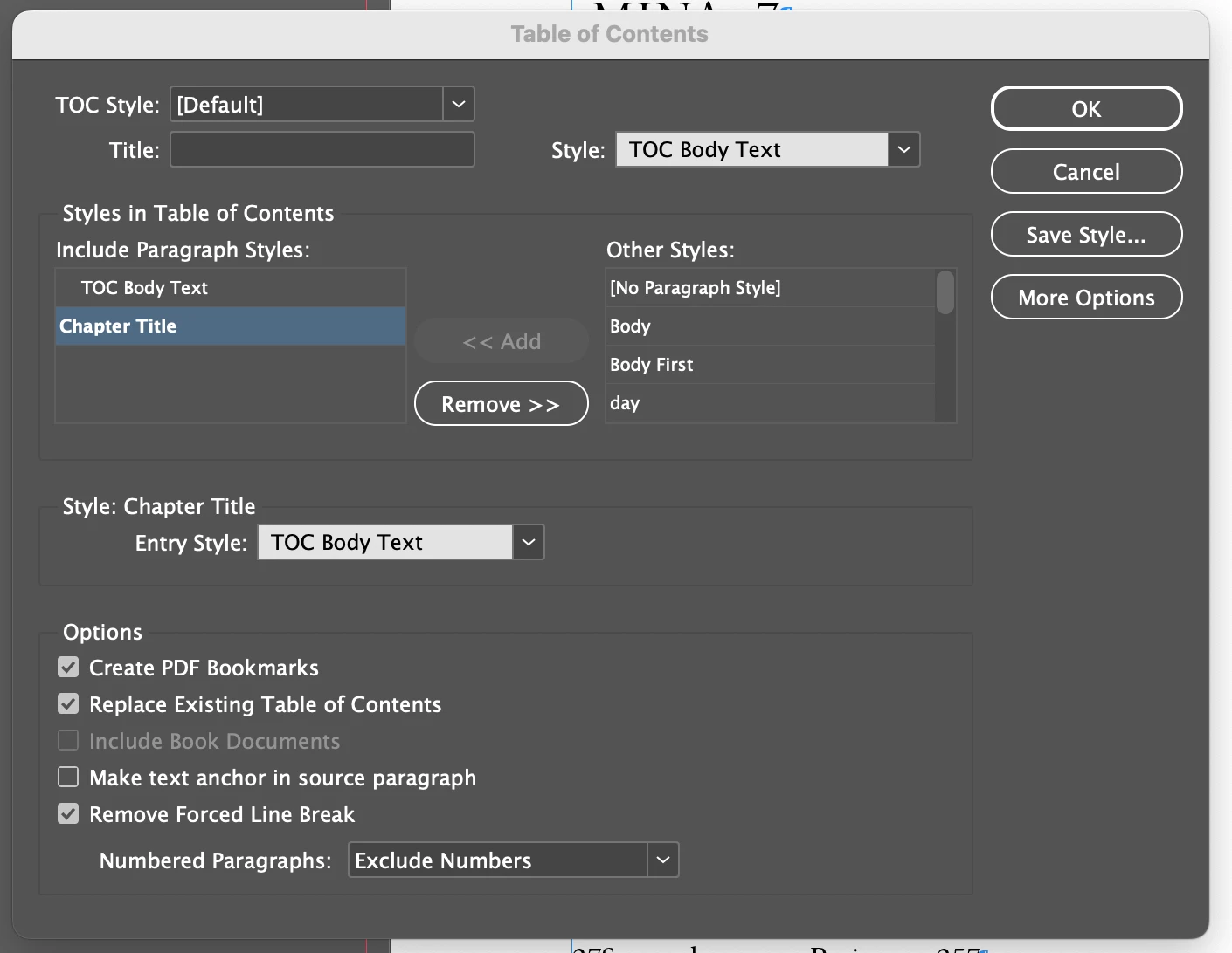 TOC pane in 2024 update (19.3) is missing a few things- see screen shots. The first one is from my version 19.3, the second screen shot is from your tutorial dated May 24, 2023. You can see the ENTRY STYLE options in the middle of the pane are missing in the new version. I am running Sonoma 14.4.1 on Apple M-3 Max. (there are documented issues with Sonoma running other software, like Scrivener.) Reinstalling indesign does not help. If you have a solution to this problem I will be forever grateful because this function is necessary for creating an e-book TOC. I'm publishing my 4th book and have been using InDesign since 2020. Thank you for your help, John