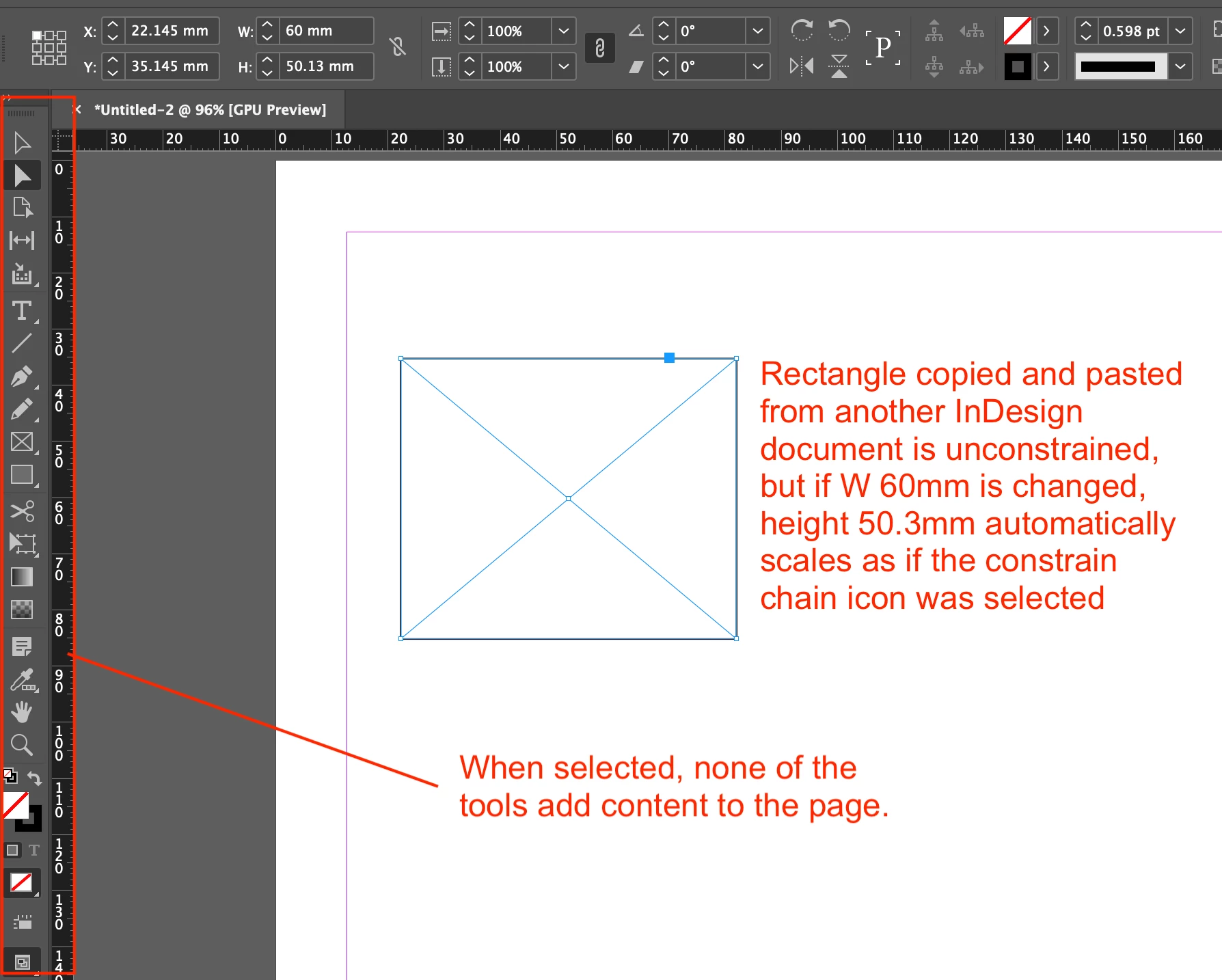 After updating InDesign to version 19.5.0.84 on iMac running OS Sonoma 14.5, the toolbar no longer works. E.g. you can select an option e.g. Rectangle frame tool but cannot add a rectangle to the page. You have to copy and paste an object from a previous InDesign document. And all objects - rectangles, ovals, text automatically constrain proportions proportions, without the constrain icon being selected.