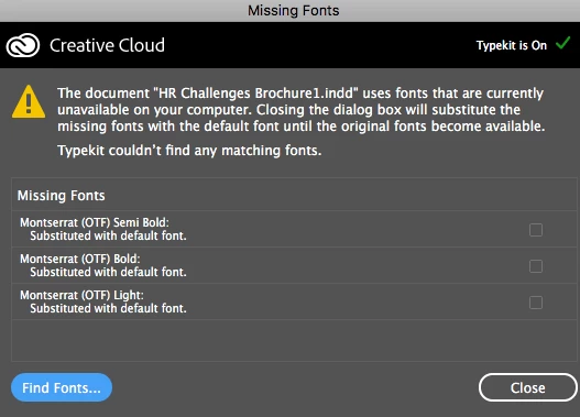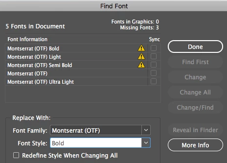 I just opened a file I created last year. The missing fonts dialogue came up and said I didn't have one of my fonts. I thought this was odd because I made this file on this computer and had packaged it when I had completed it. I went ahead a reloaded the missing font only to find that font was already loaded on this computer. In the find font dialogue I chose the missing font and selected that font in the replace field. Nothing happened. Does anyone know why this font isn't working even though it is installed and was used previously? I am using Indesign CC on a MAC os.