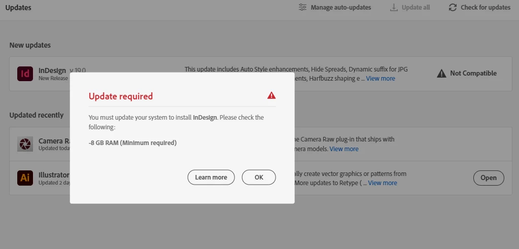 I am using InDesign for a class and it won't let me open the program without updating. However, when I click the update button, it tells me that my computer is not compatible and that I must have a minimum of 8 GB of RAM (which I know that my laptop has). I have restarted and updated pretty much everything on my computer but that's not doing anything, and the only other suggestion I have received is to remove and redownload the whole program. I'm hesitant to do this since it took so long the first time I downloaded it. Is this my only option or is there another way for me to be able to update the program?