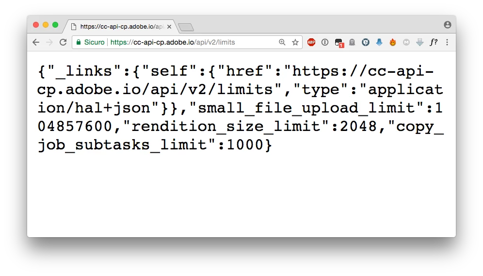 The text i get is {"_links":{"self":{"href":"https://cc-api-cp.adobe.io/api/v2/limits","type":"application/hal+json"}},"small_file_upload_limit":104857600,"rendition_size_limit":2048,"copy_job_subtasks_limit":1000}