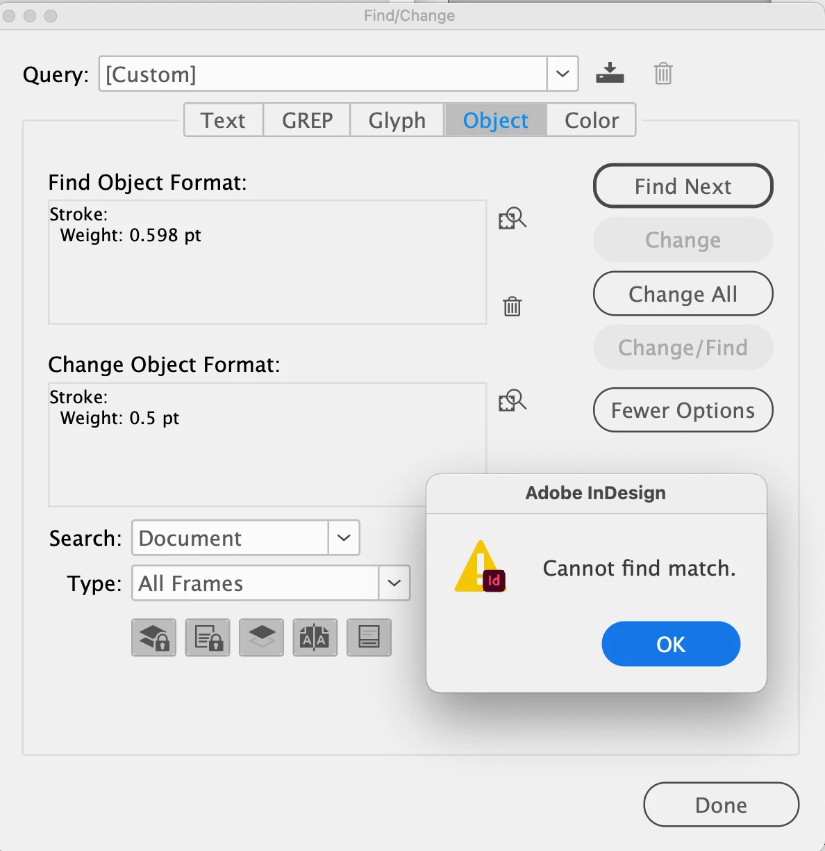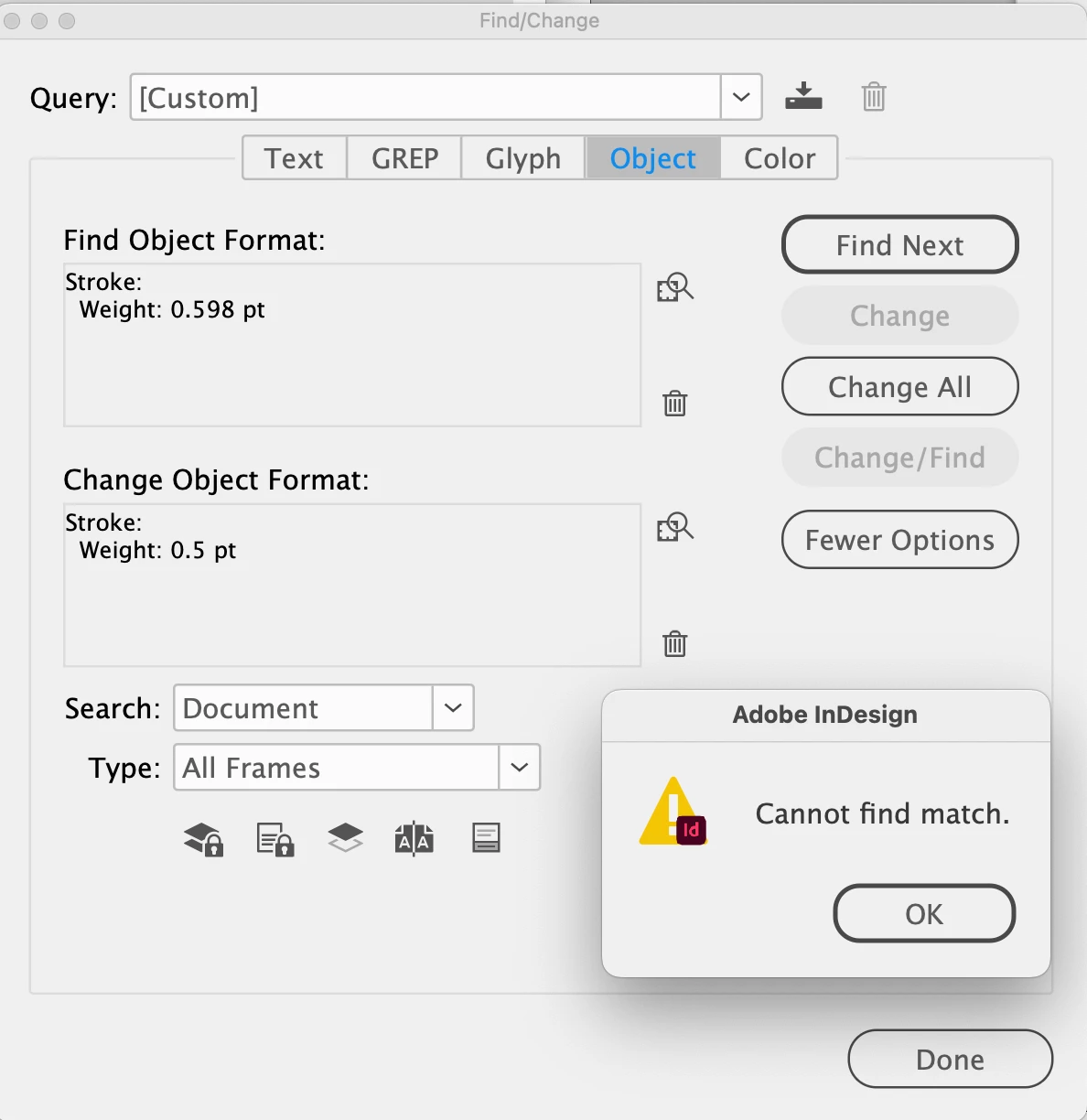 I have a multipage document with many .598 strokes/rules. I want to change them all to .5. I tried using Find/Change Object but keep getting a "Cannot find match" message.