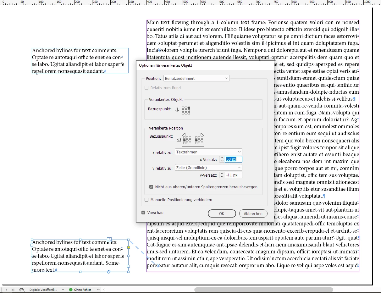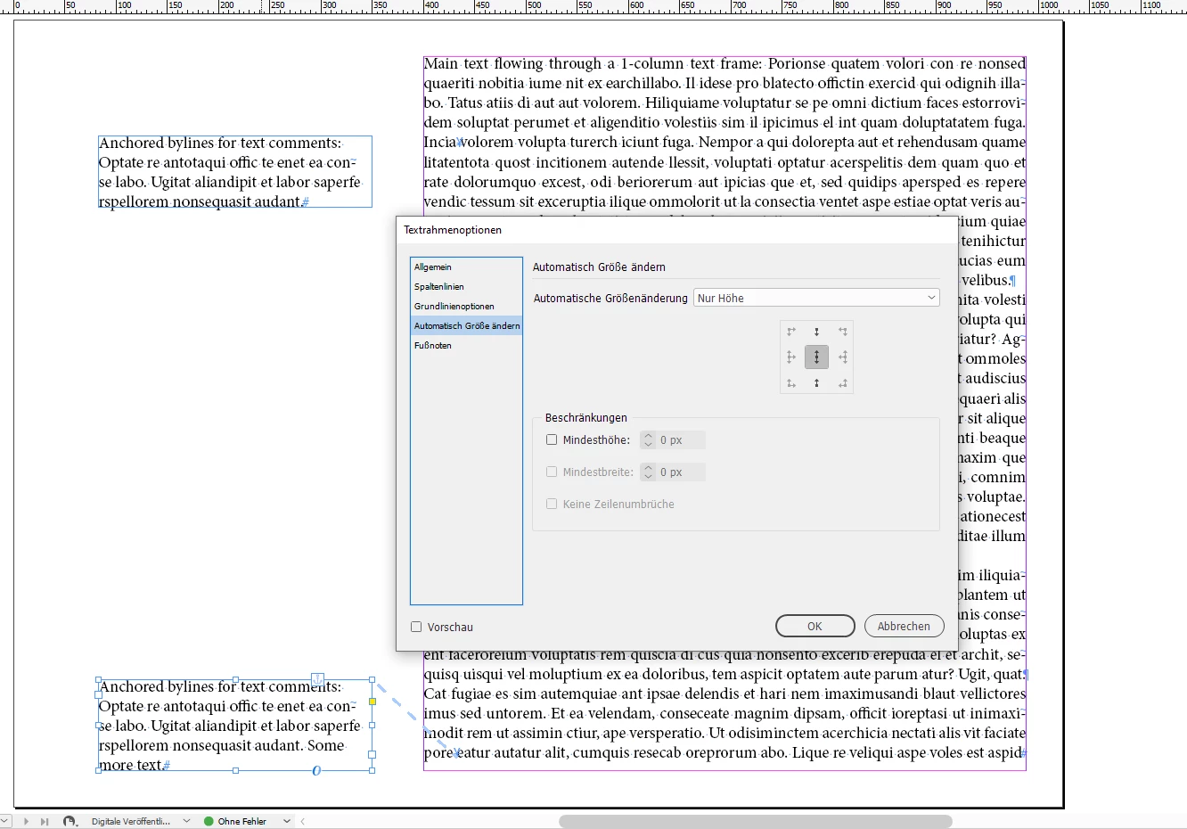 The main text will flow in a 1-column text frame. The anchored frames are set to auto-height.