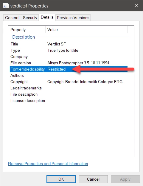 Where did you download the font from? It certainly is not a font bundled with Windows, Microsoft Office, or any Adobe product. I found a “free” version of that font at https://www.dafontfree.net/freefonts-verdict-sf-f129172.htm . Checking the properties of the font shows:
