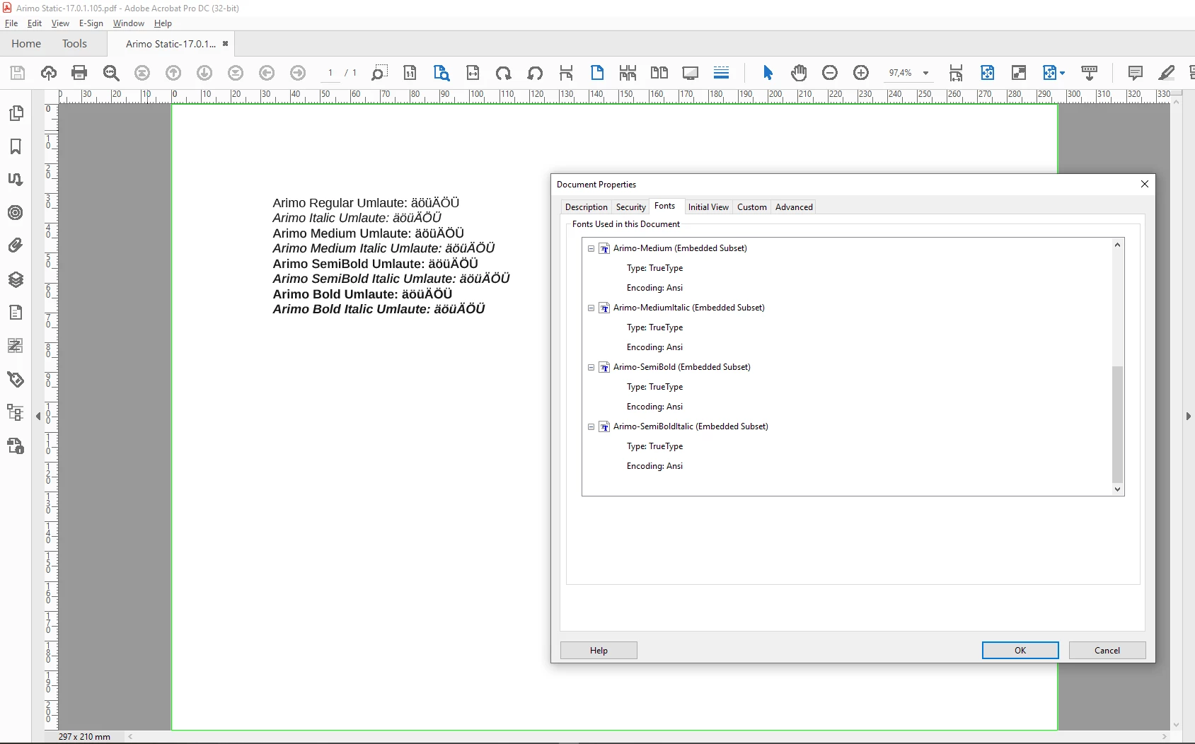 ich sehe gerade, die Arimo ist in den Schnitten Regular, Italic, Bold und Bold Italic bei mir im System unter C:\WINDOWS\Fonts bereits vorhanden. Und mit dieser Version der Schrift habe ich keine Probleme mit den Umlauten, wenn ich Deine Datei nach PDF exportiere. InDesign 17.0.1.105 unter Windows 10.