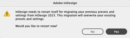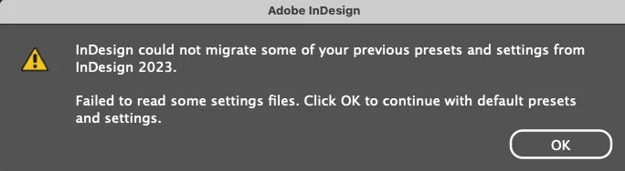 Doesn't work on our Macs either. New M1 and M2 macs. Get the settings were created on a different version of InDesign. Well, yes, of course! And it overwrites to default. Even manually copying over our prefs into the new ~/Library file doesn't work. Just get the same error the next time. So bad. And it even deleted our IN5 plugin.