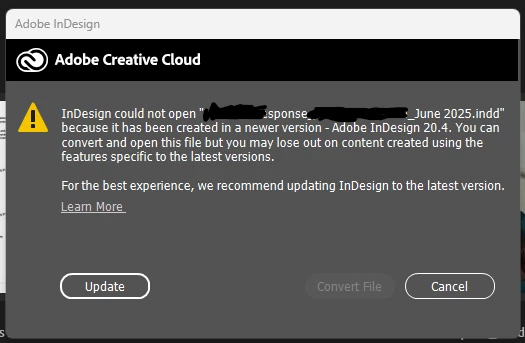 I am attempting to open a file created in May 2025 in Adobe InDesign 20.4. I now have 20.5 installed on my device, so I'm getting an error message. I try to "Convert File" and nothing happens. When I click "Update," nothing happens as I already have the latest version of InDesign.