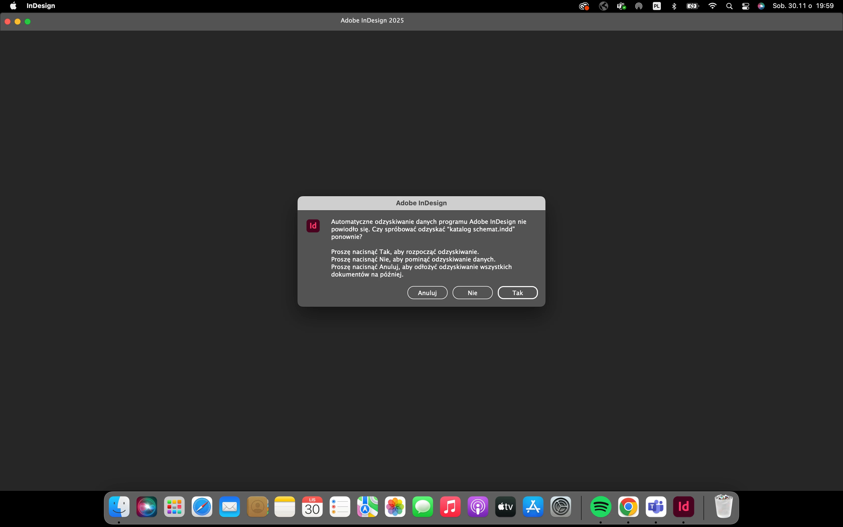 Automatic recovery of Adobe InDesign program data failed. Would you like to try to recover "katalog schemat.indd" again?
