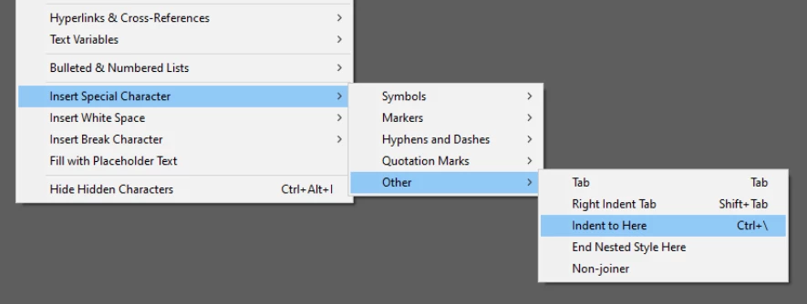 Unable to use the type function "Indent to here" in InDesign 18.1 version