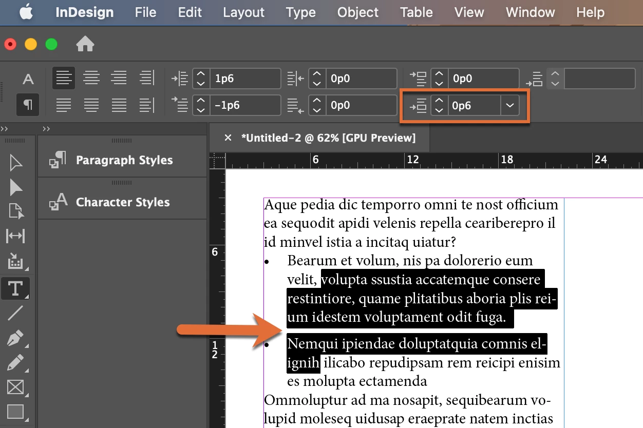 Feeling kind of silly here, but I can't get my head around this. I have templates with a Bullet style. In one document, I have a list with JUST TWO BULLETS. As sometimes happens, I've been asked to shift the second bullet down a bit to accommodate a very small diagram between the two bullets. It is an exception to the style and that's fine. Normally I'd go into Paragraph and tweak this instance. But if I click in the first bullet and try to change Space After, nothing happens. If I click in the Second bullet and try to change Space Before, nothing happens. I don't really want to mess with the style itself as I don't want this change elsewhere. I just want this... exception. How do I override the new feature and just put some extra space where I want it? Do I really have to create another style just to accommodate this quirk? I will if I have to, but it seems silly when all I want is the one-time override particular to this instance.