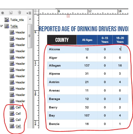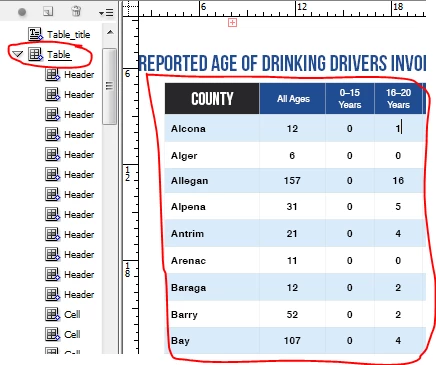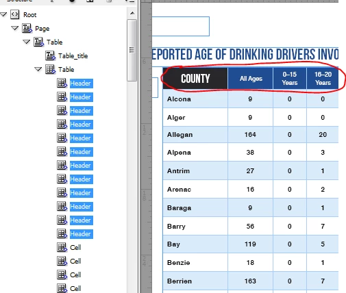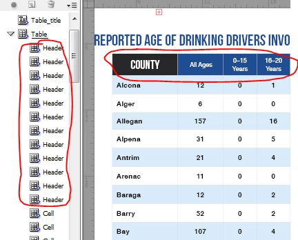 I've tagged several tables in InDesign to export them to XML. I'd like to untag the top row of cells (circled in red, currently tagged as "header"), while retaining all the interior cells (currently tagged as "Cell"). I want this because when I re-import the XML, the text wrapping in the header cells disappears.