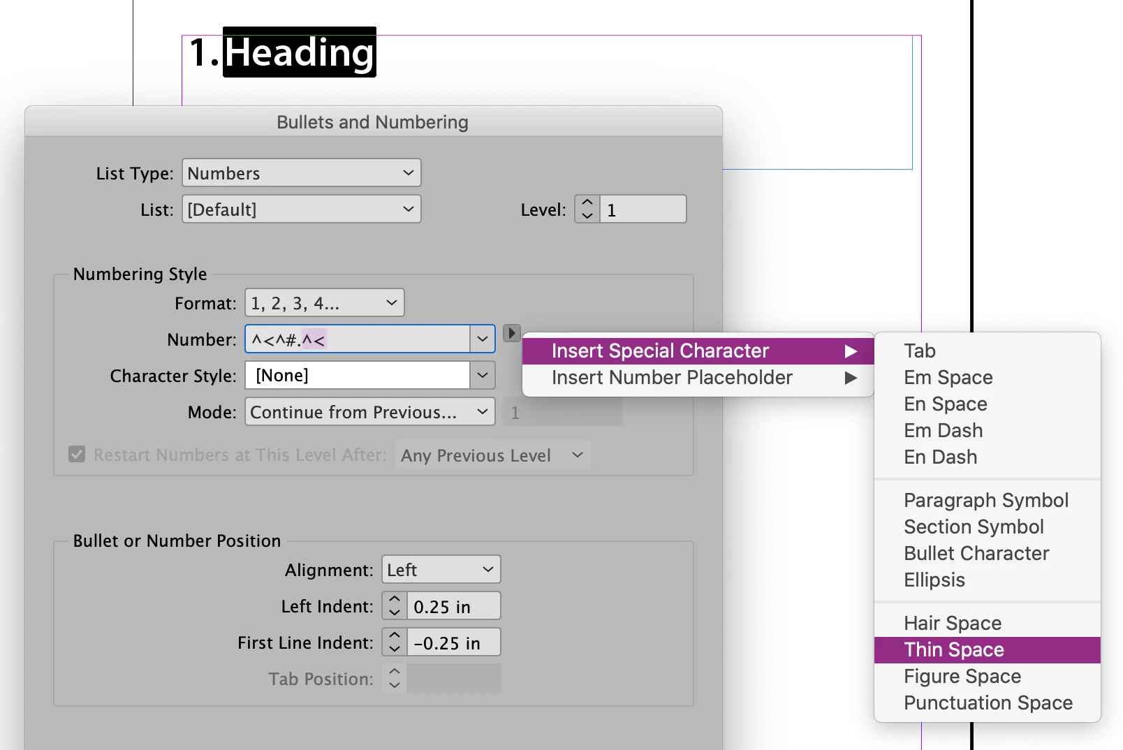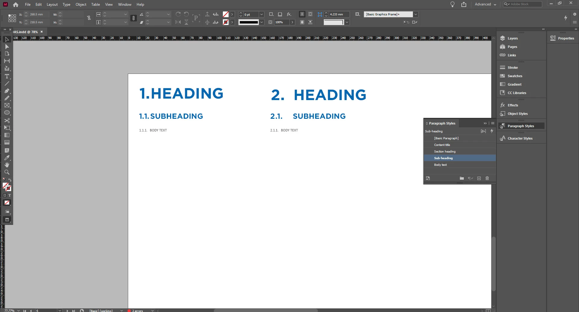 I'm preparing a document with numbered headings, sub headings and body text with three levels. section 1, sub heading 1.1. and body text 1.1.1 etc. I have set everything up in paragraph styles.