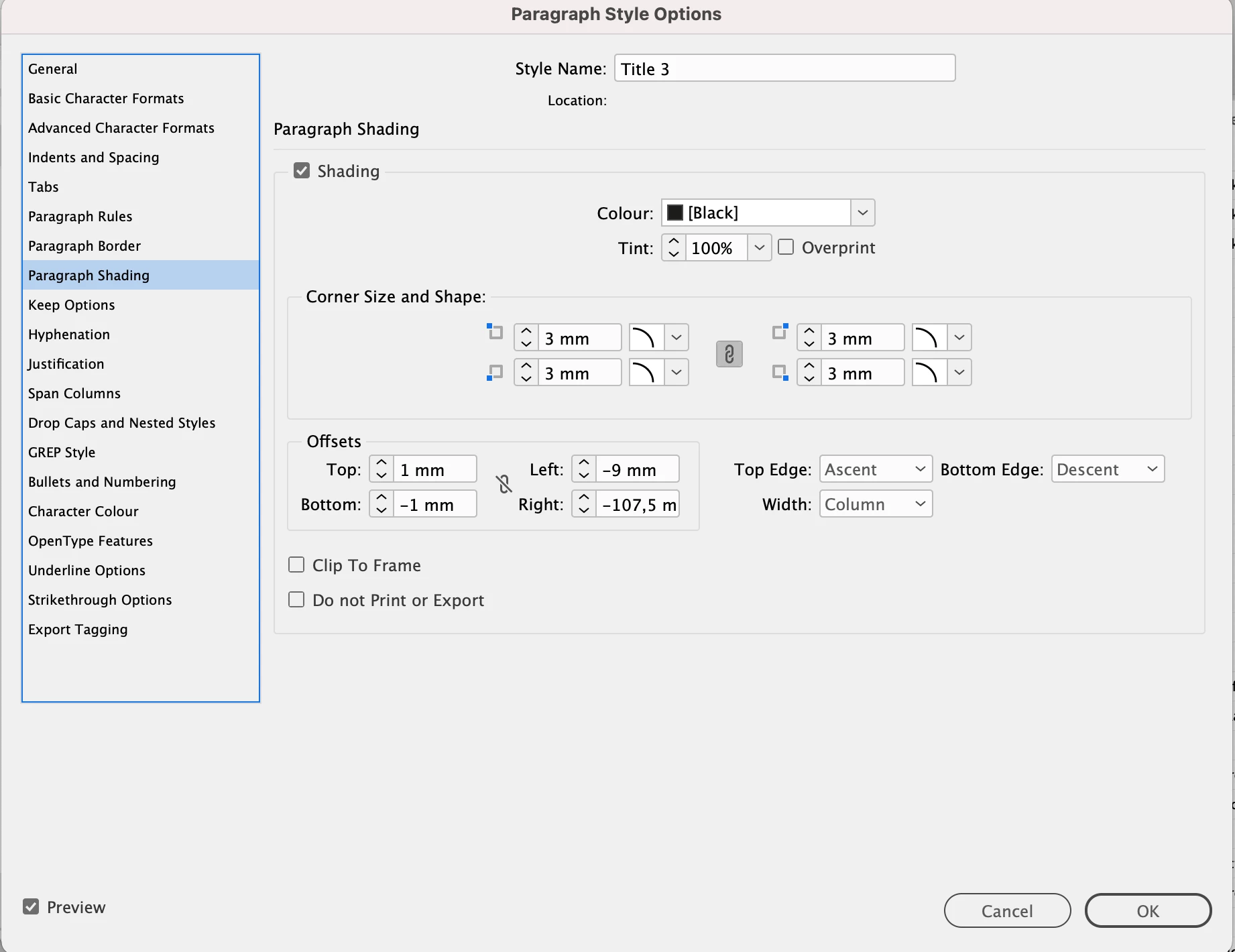 - I have used shading to create the black background. Se settings below.