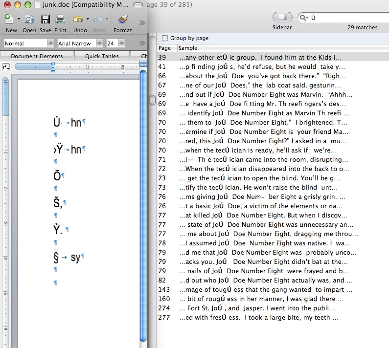 1. )    The JoÚ was being treated as an actual ligature, I could search for John and it would find the JoÚ.