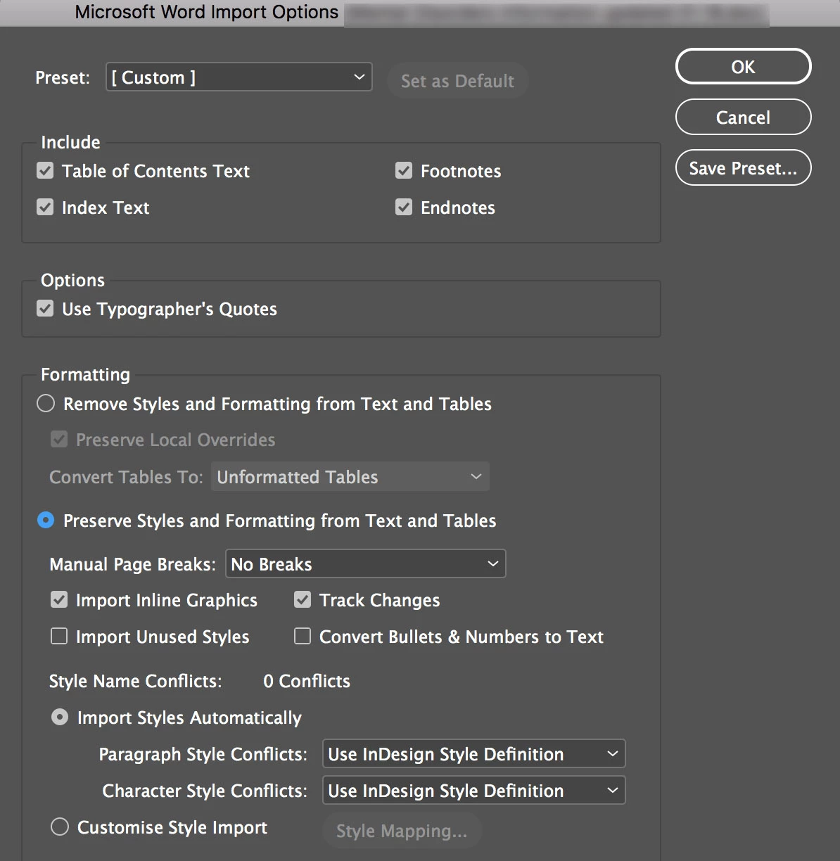- On body page 1, File > Place. Select the Word document and click Open.