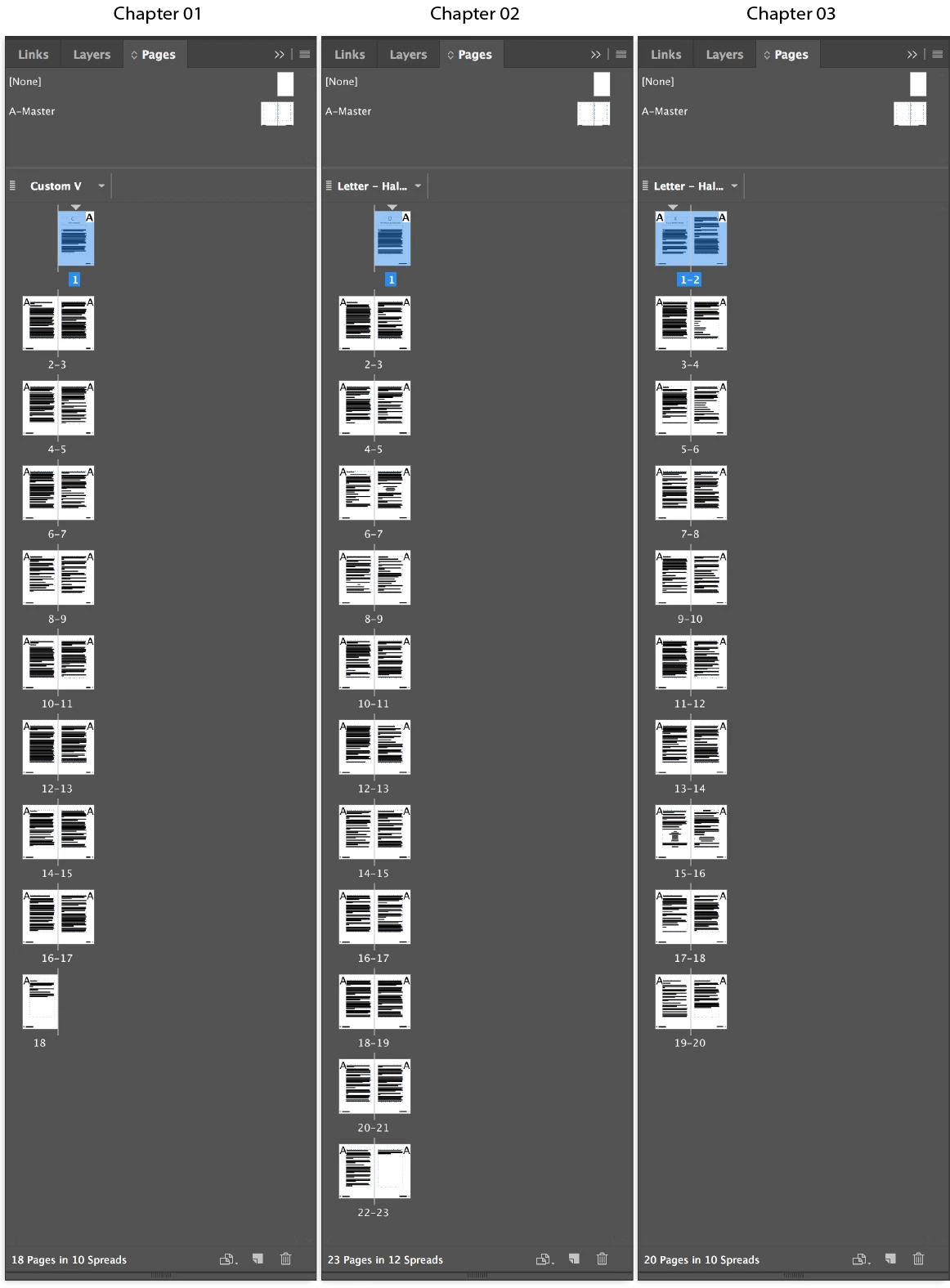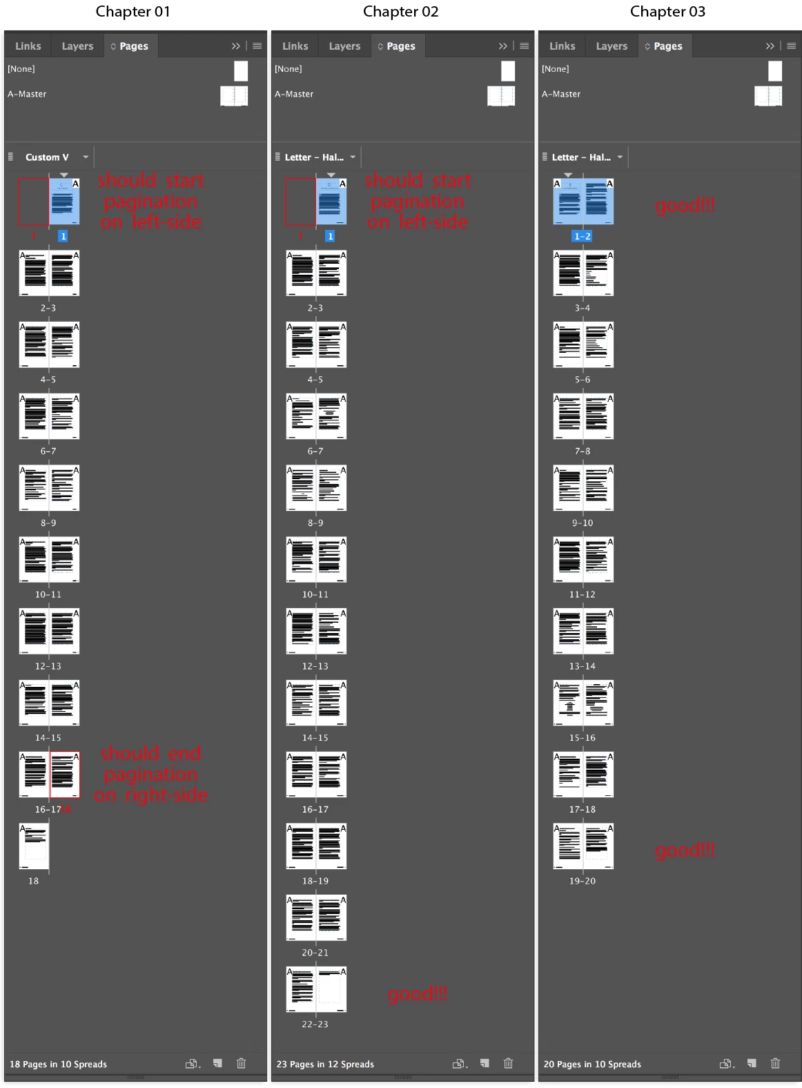 I am trying to create a PDF and ePUB of the book I have create in InDesign, however the pages are not flowing properly. I have some nice flowing spreads and then two random pages that stick out as individual pages. All the chapters are individual files with facing pages that I have saved into a book that has been synchronised. How do I get all the pages flowing nicely?