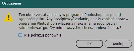 This image was saved in Photoshop without full file compatibility. To speed things up, save the image in Photoshop with maximum compatibility enabled and import it. Do you still want to place the image?